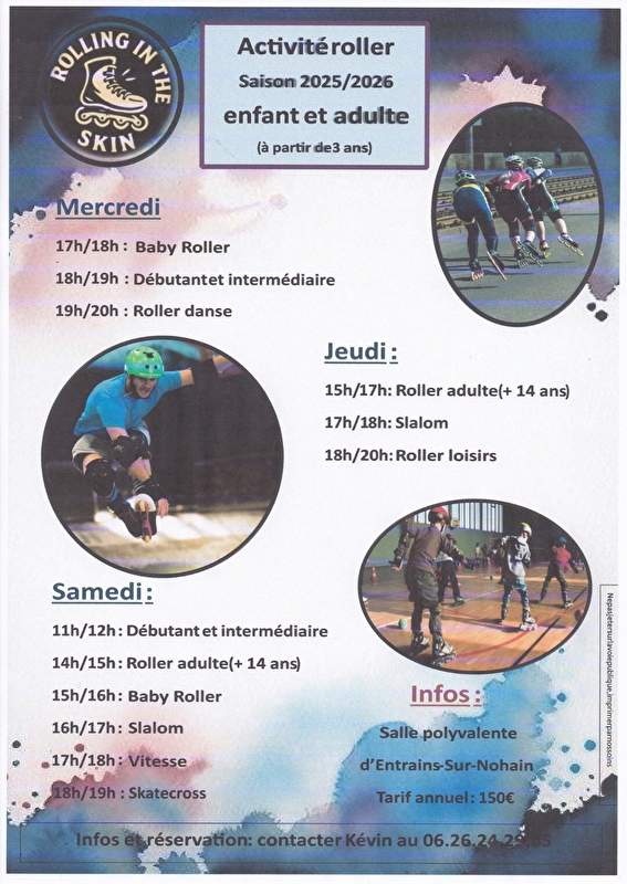 "Rolling in the skin" propose des cours de roller enfants/adultes les mercredi, jeudi et samedi : baby roller, roller danse, slalom, roller loisirs, vitesse, skatecross... infos et réservation : Kévin 06 26 24 29 65