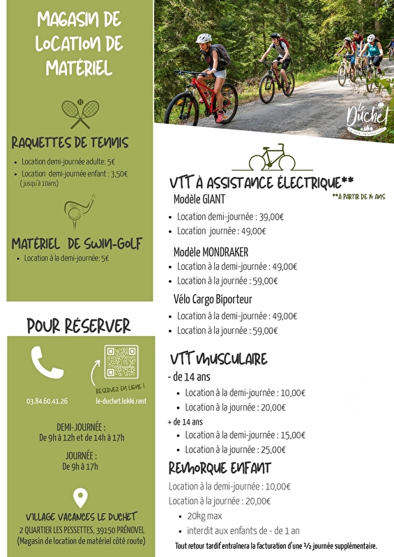 Située sur le plateau du Grandvaux, dans le Parc naturel régional du Haut Jura, la base VTT Village vacances Le Duchet, de la Fédération Française de Cyclotourisme, vous propose un lieu de découverte et de pratique du VTT de tous niveaux et avec un équipement complet :
