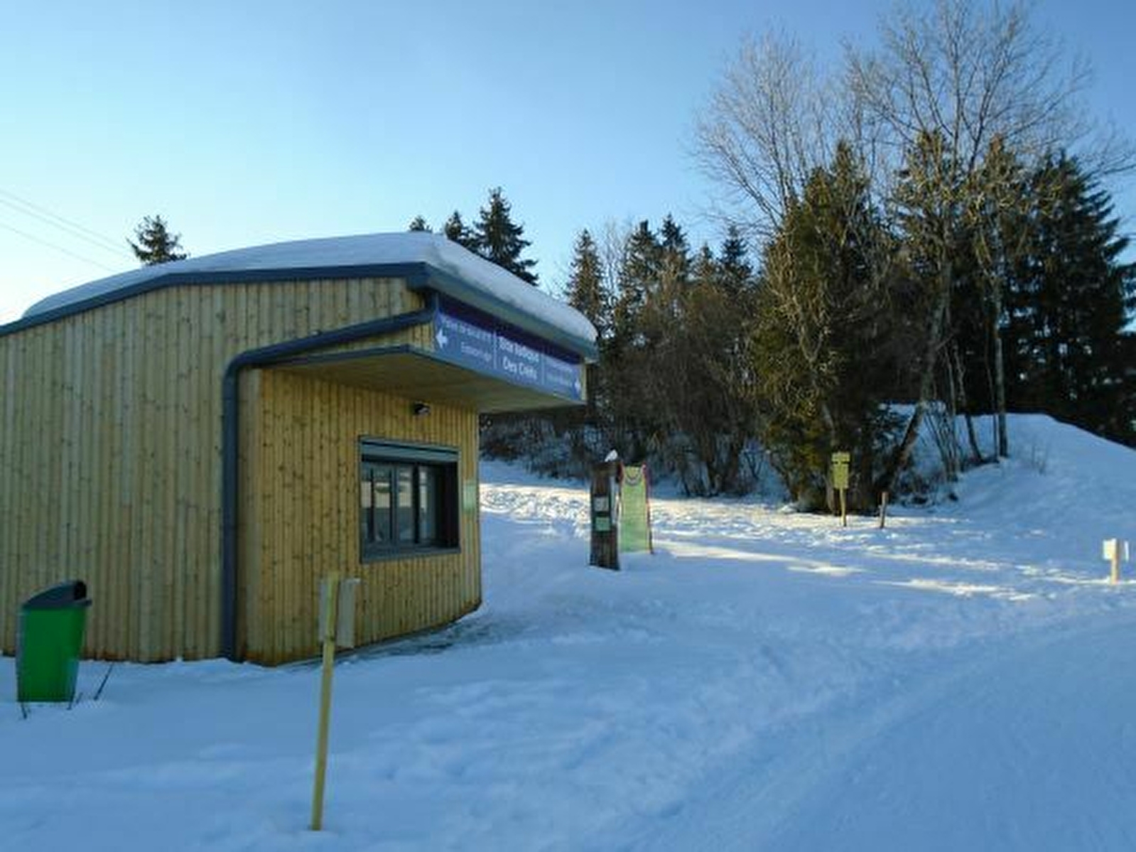 Départ des itinéraires au rond-point sur les Crêts à la sortie de Saint-Laurent en direction de Morbier / Genève. Parking et location de matériel Traces d'Aventure au départ.