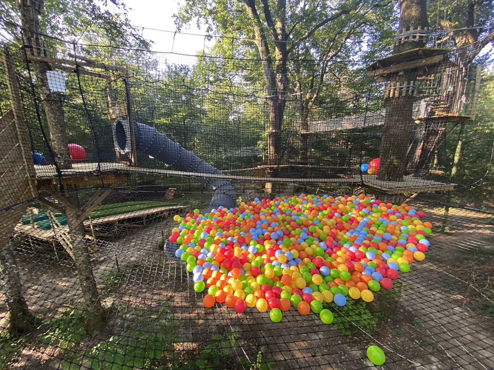 Notre parcours de filets dans les arbres est composé de trois vastes zones de filets, chacune s’étendant sur 30 m². Suspendus dans les arbres, ces filets offrent une expérience semblable à celle de marcher sur un trampoline géant, flottant au-dessus du sol. Cette activité est parfaite pour les petits enfants comme pour leurs accompagnants, permettant à chacun de se détendre, de jouer ensemble en toute sécurité.