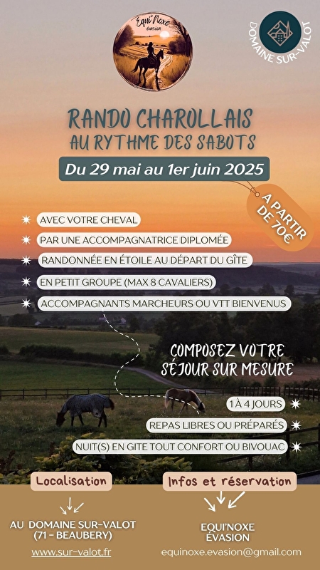 Le Domaine Sur-Valot, en partenariat avec Chloé (Accompagnatrice de Tourisme Equestre) vous propose des randonnées avec votre cheval. Laissez-vous guider au rythme des sabots sur les chemins de la région en petit groupe de maximum 8 cavaliers. Les accompagnants marcheurs ou VTT sont les bienvenus.