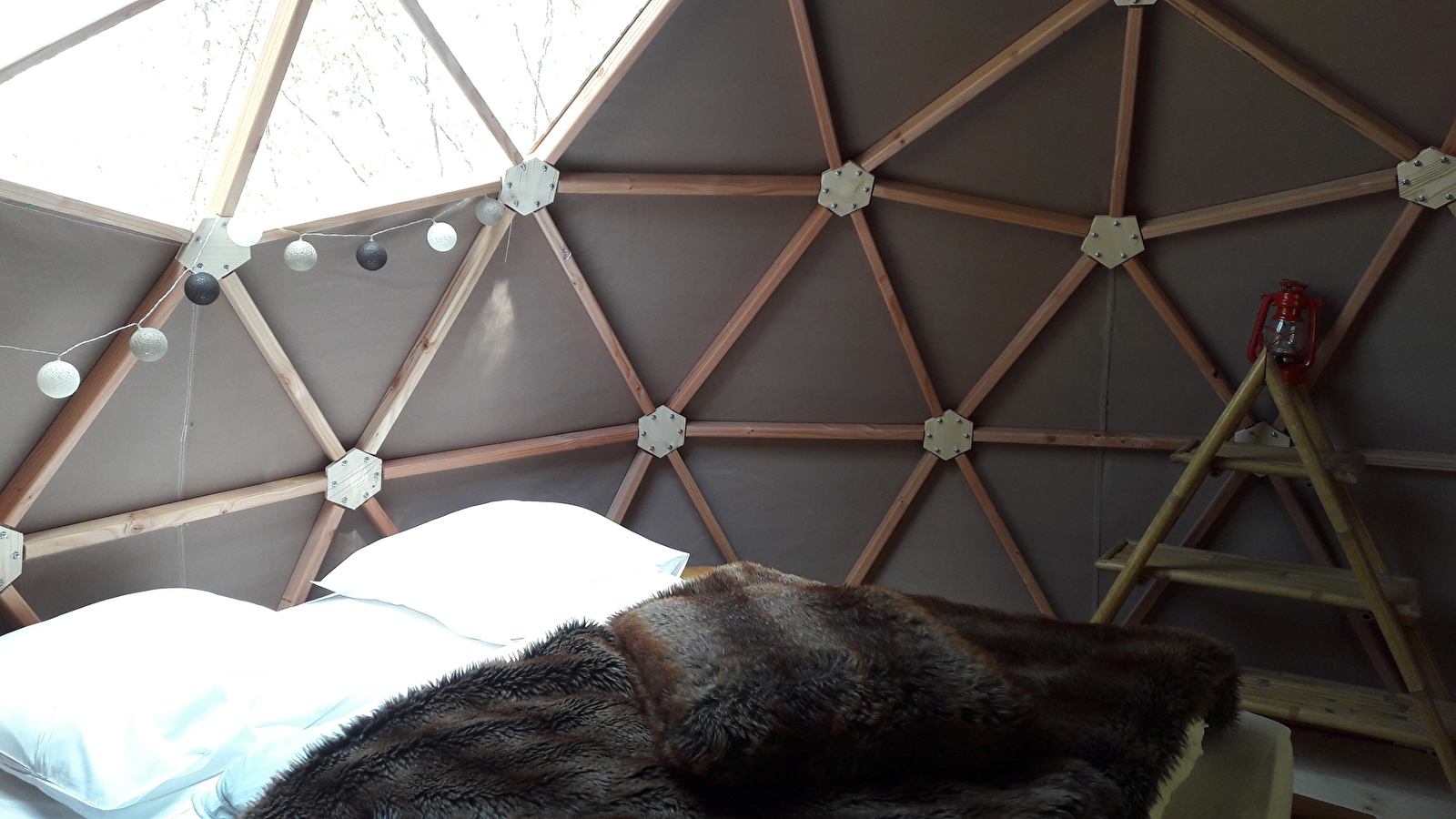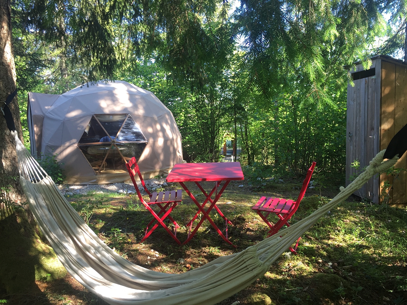 Au Domaine du Bugnon, au Lac des Rouges Truites, dôme géodésique, hébergement toile et bois de 12m² pouvant accueillir 2 personnes.