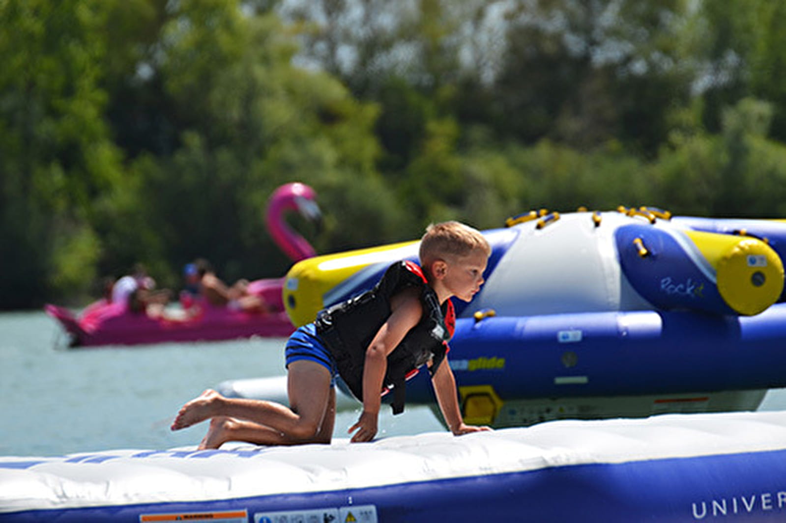 Parc Aquatique sur le lac de Desnes : murs d'escalade, toboggans, trampolines....