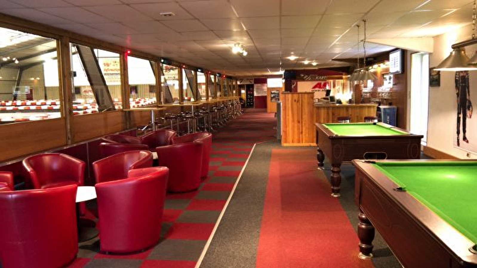Pour une ambiance conviviale et accueillante, le clubhouse donne une vue panoramique sur la piste. Il est équipé d’un bar, de billards, simracing...