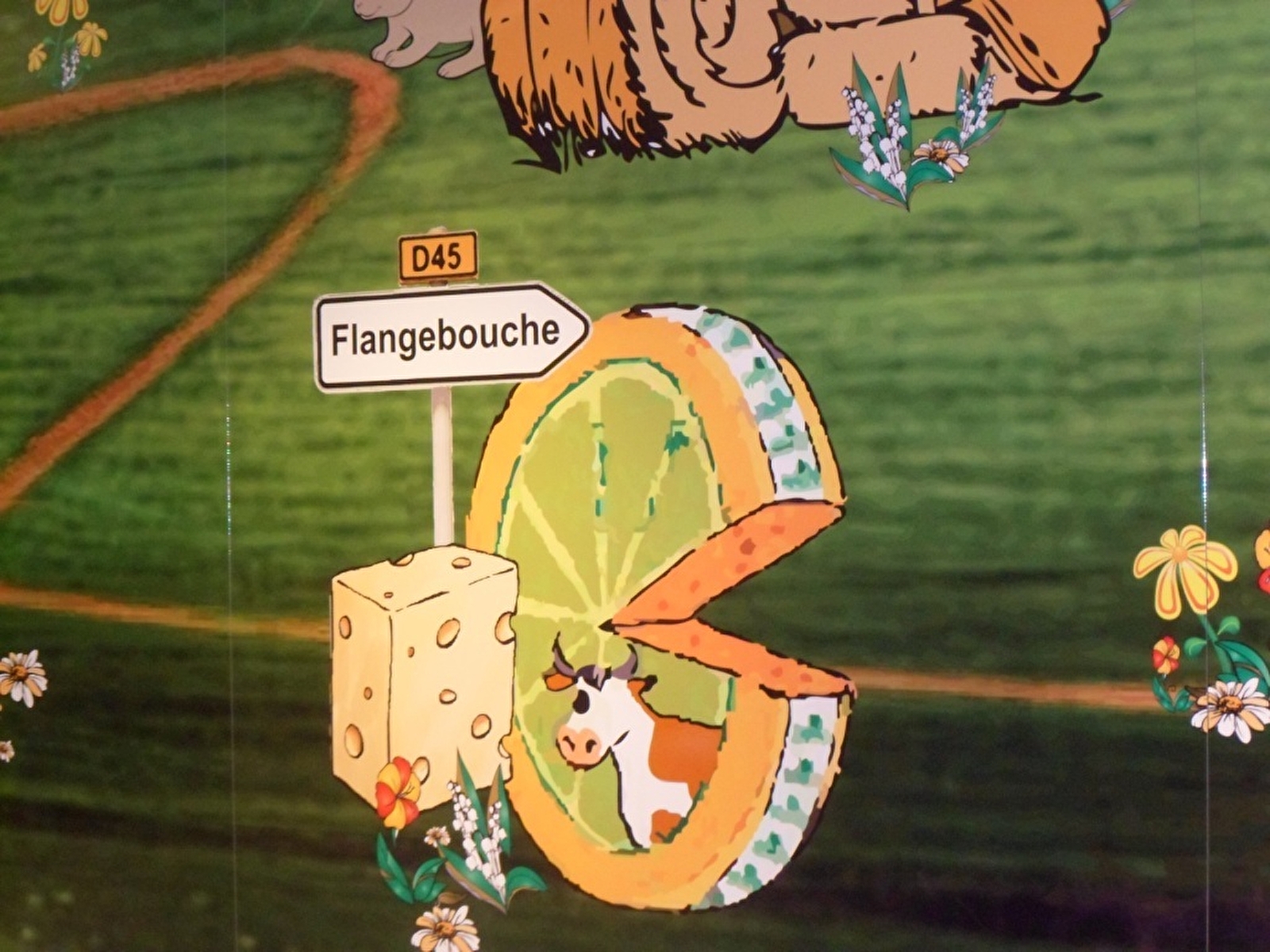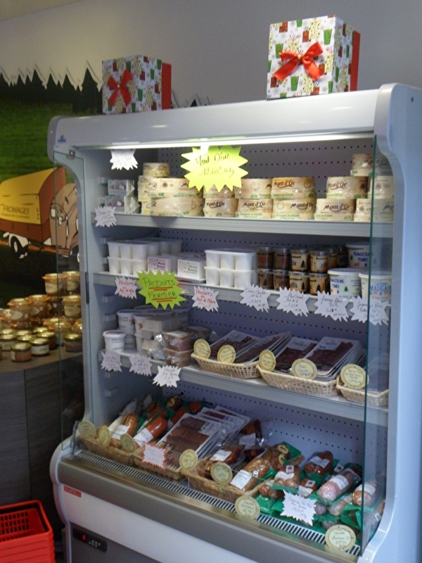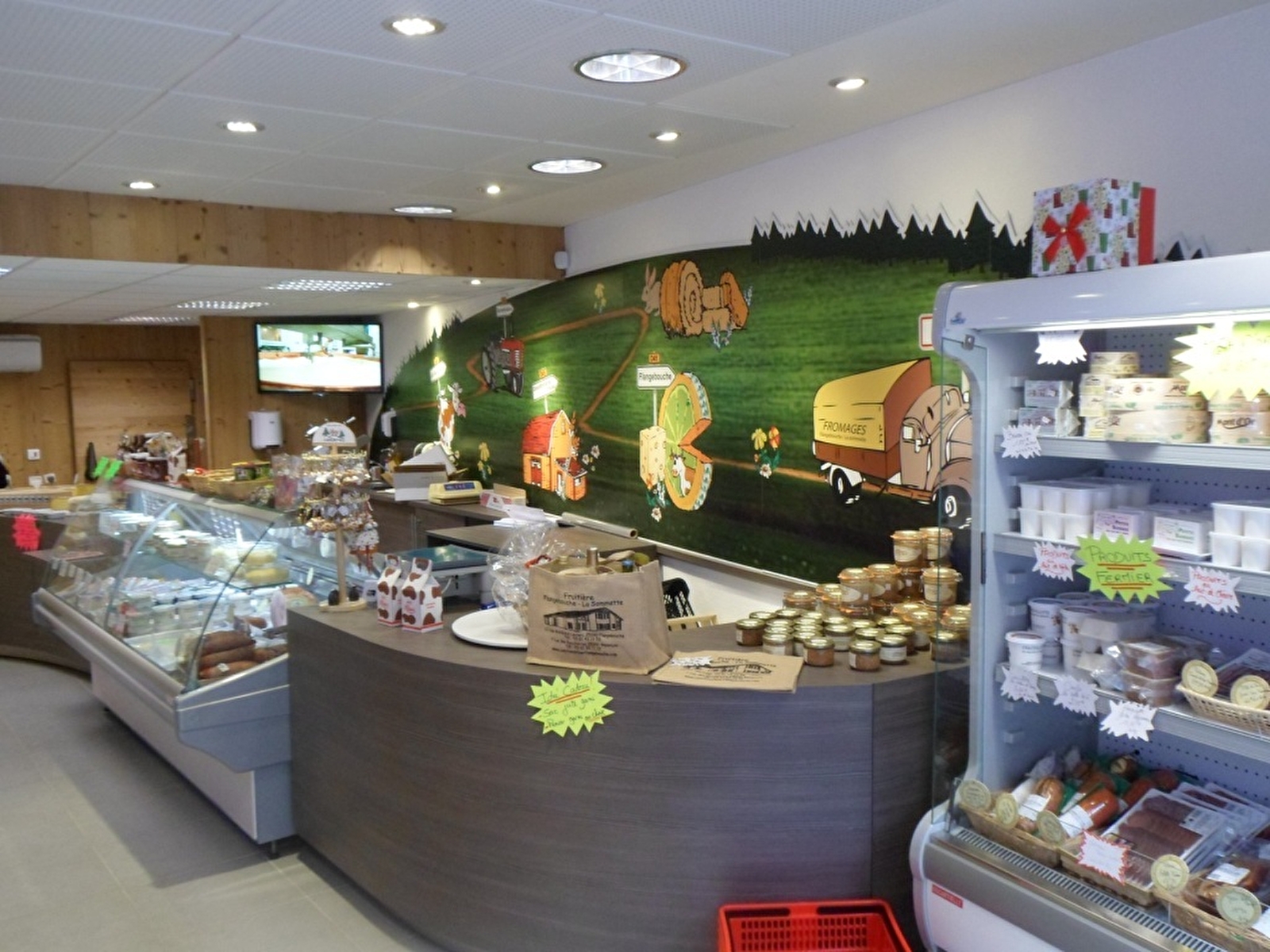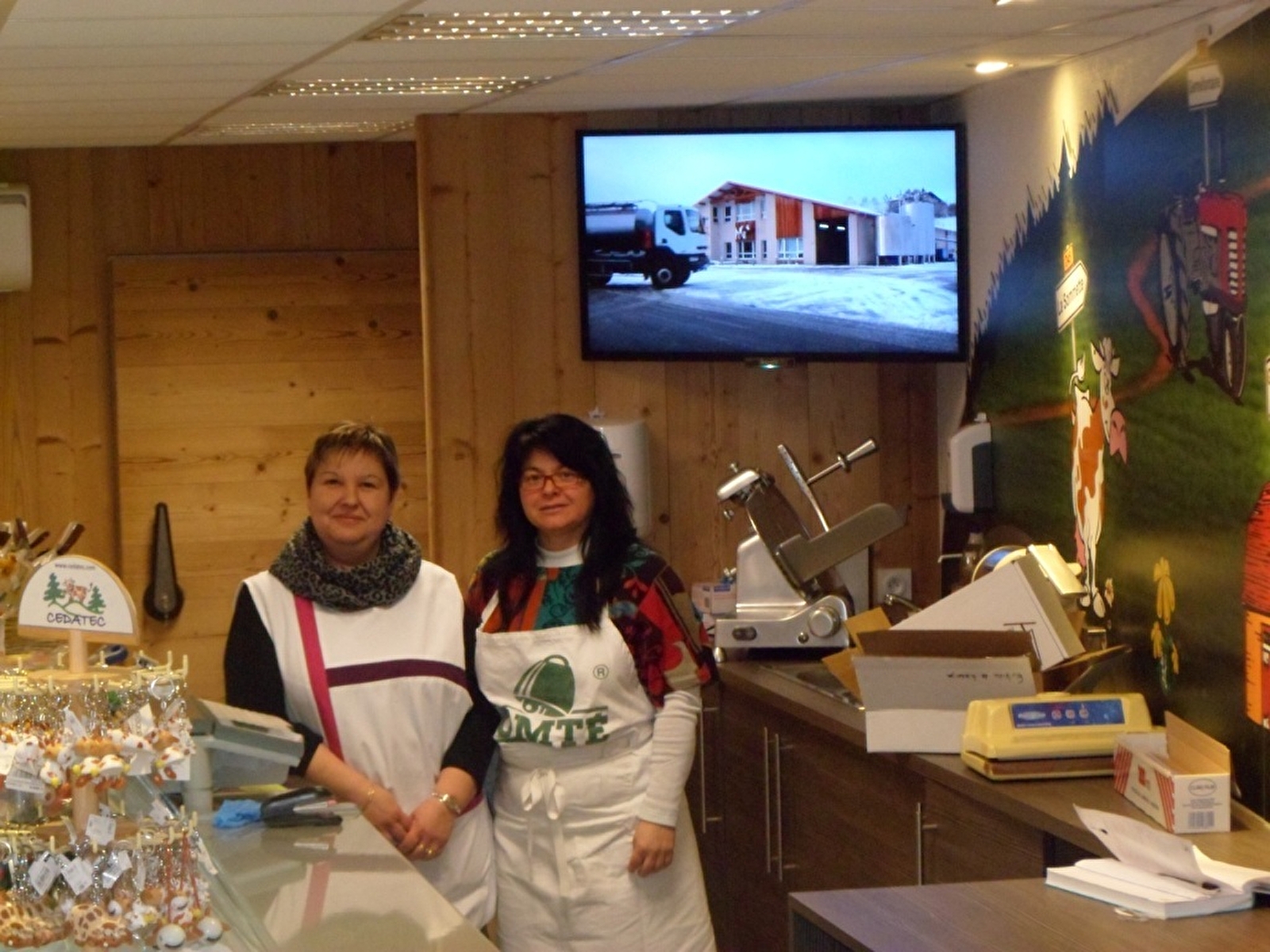 La Fruitière vous accueille dans son cadre typiquement régional : bois, fresque du circuit de production... aussi une vidéo vous présente le travail des agriculteurs, de la traite à la fabrication du Comté.