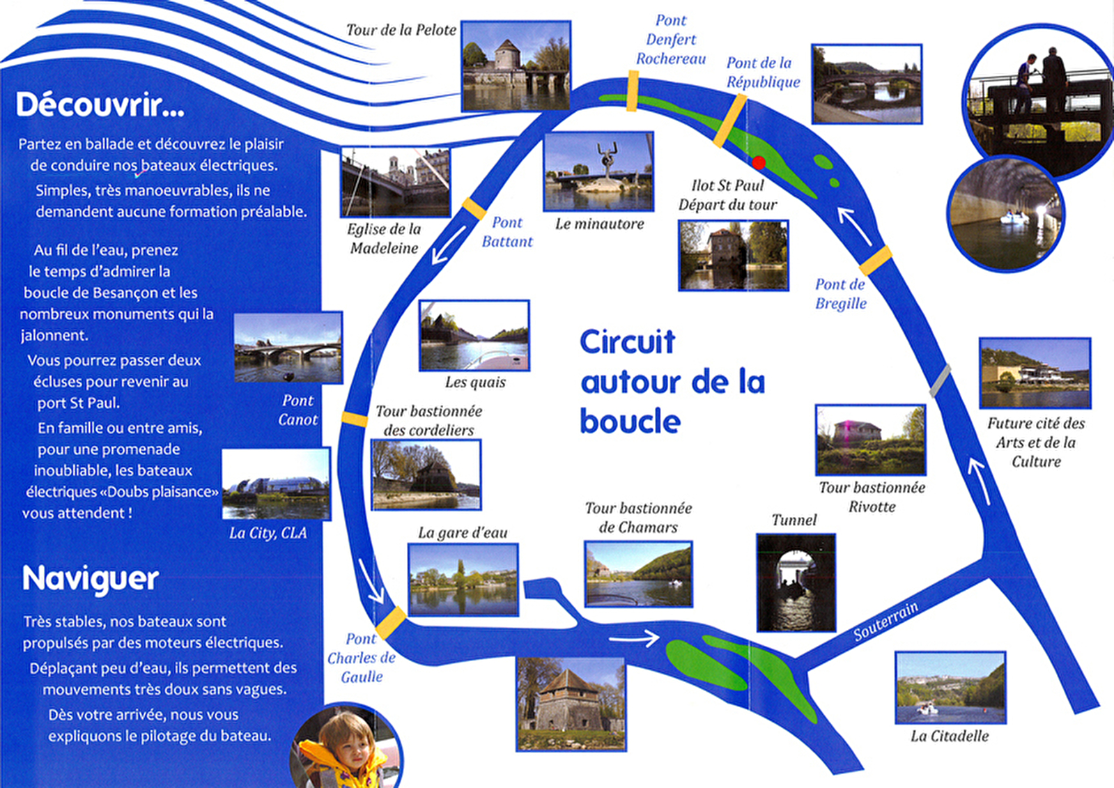Au fil de l'eau, prenez le temps d'admirer la boucle de Besançon et les nombreux monuments qui la jalonnent. Vous pourrez passer deux écluses pour revenir au port St-Paul. En famille ou entre amis, pour une promenade inoubliable.