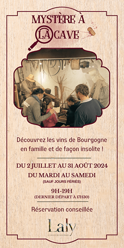 Benoît Laly, propriétaire de la cave, compte sur vous pour trouver le coupable. Au fil de votre enquête, vous découvrirez la Bourgogne viticole sous ses différents aspects : histoire, terroirs, cépages, vinification, arômes... Votre jeu se terminera par une dégustation de vins de Bourgogne pour les adultes et de sirops à l’aveugle, pour les enfants.