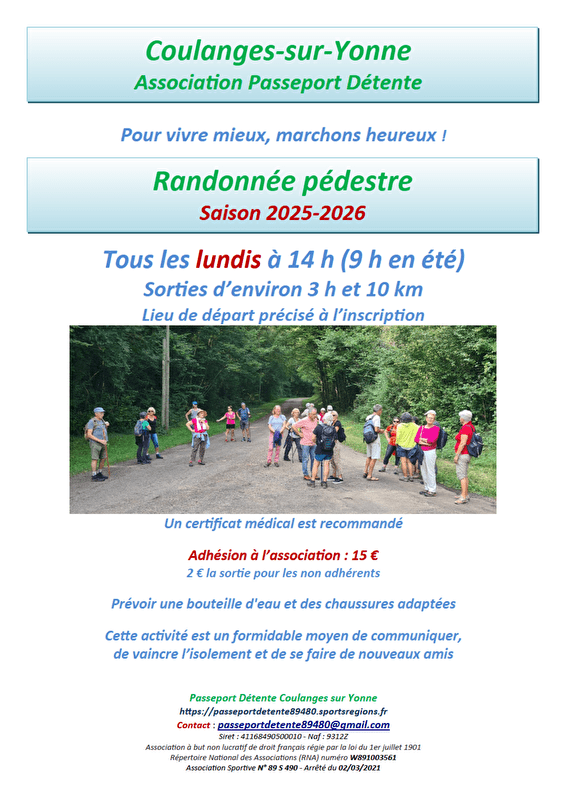 Randonnées d'environ 10 kms (3h). Lieu de départ précisé à l'inscription. Un certificat médical est recommandé. Prévoir une bouteille d'eau et des chaussures adaptées. Adhésion à l'association 15€ et 2€ la sortie pour les non adhérents.