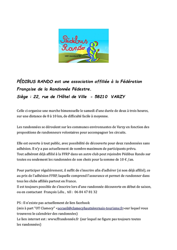 Association affiliée à la FFRP, Pédibus Rando vous propose des marches bimensuelles d'une durée de 2 à 3 heures pour une distance de 8 à 10 km, de difficulté moyenne - Ouvert à tout public - Possibilité de découverte pour 2 randonnées sans adhésion