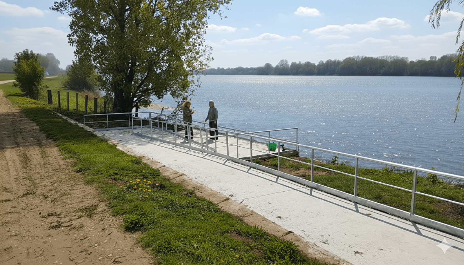 Un espace inclusif. Grâce à un nouveau ponton de pêche accessible PMR, nous veillons à ce que chacun, y compris les personnes à mobilité réduite, puisse profiter pleinement du plaisir de la pêche et du cadre apaisant de la rivière.