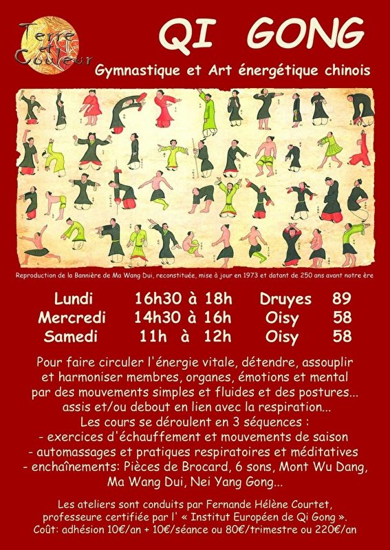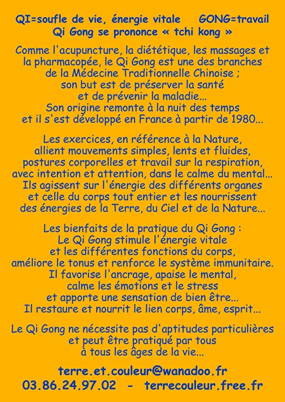 L'association Terre et Couleur propose des cours de Qi Gong dont la pratique stimule l'énergie vitale et les différentes fonctions du corps, améliore le tonus et renforce le système immunitaire. Le Qi Gong ne nécessite pas d'aptitudes particulières et peut être pratiqué par tous, à tous les âges de la vie. Les cours sont conduits par Fernande Hélène Courtet, professeure certifiée par l'Institut Européen de Qi Gong - Renseignements au 03 86 24 97 02