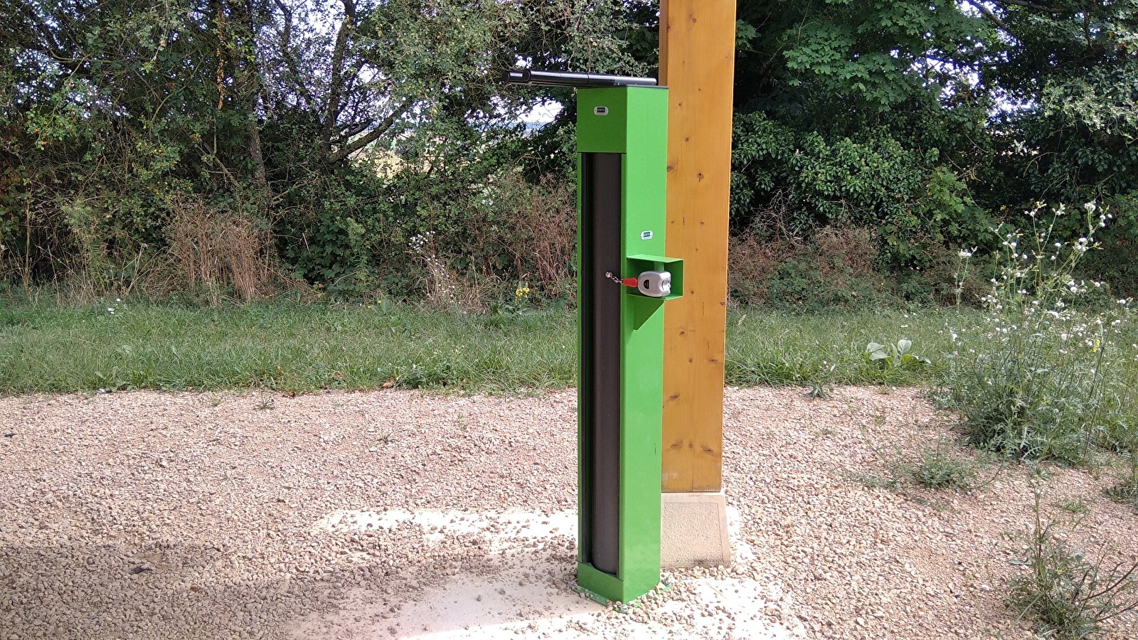 Station autonome de réparation de vélos située sur l'aire de pique-nique en bordure de la voie verte. Installée sous un préau, la station permet de réparer son vélo à l'abri. Payante (pièces de 0,5/1€).