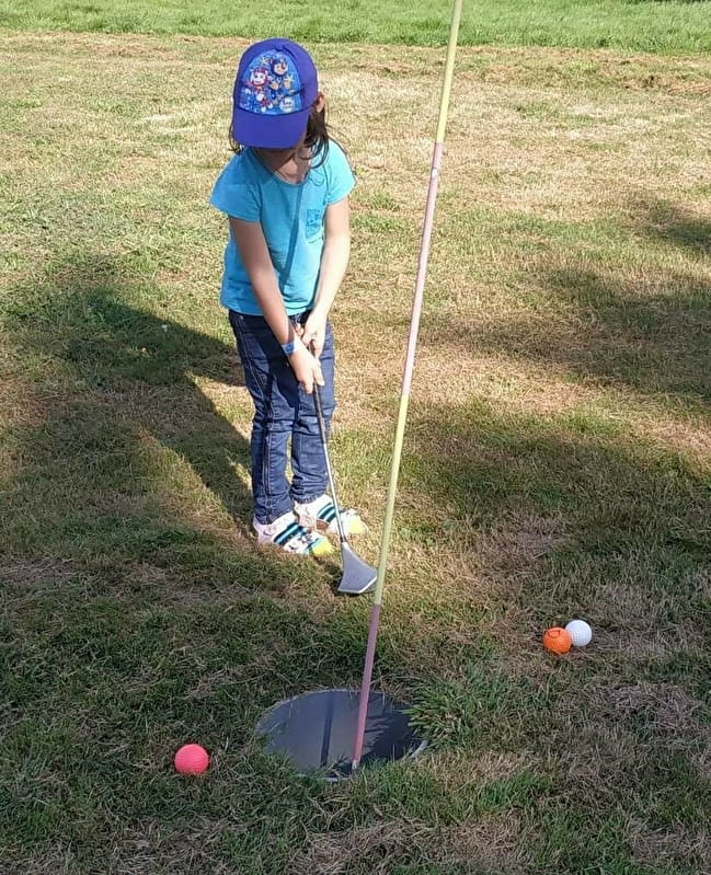 > Activités swin golf : parcours 9 trous. Départ vers un trou de 30 cm de diamètre, à l’aide d’une canne unique multiface, en le moins de coup possible.