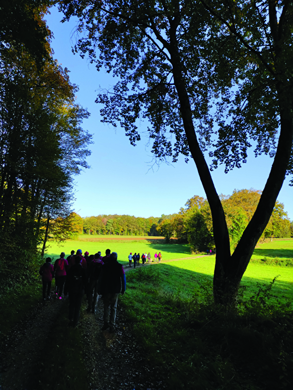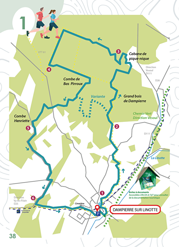 1• Quitter la place et passer entre l’église et l’école. Après la traversée de la route principale, prolonger pour accéder à la Fontaine Saint-Maimbœuf, et au pont de l’ancienne route de Vesoul. Conserver cette route et traverser la Combe de Tevey. À la fourche, tourner à droite puis à gauche pour accéder à l’entrée du Grand Bois de Dampierre.