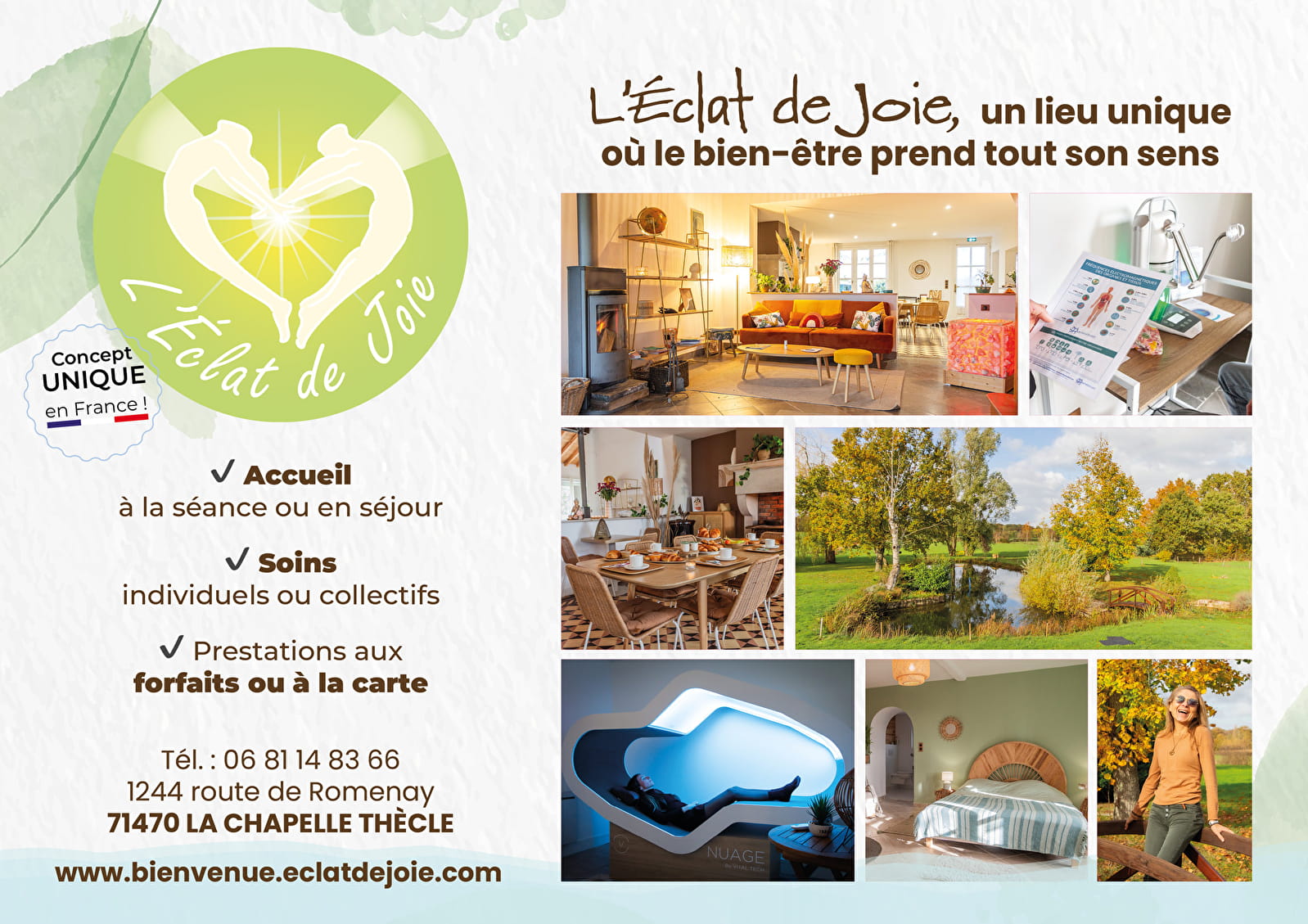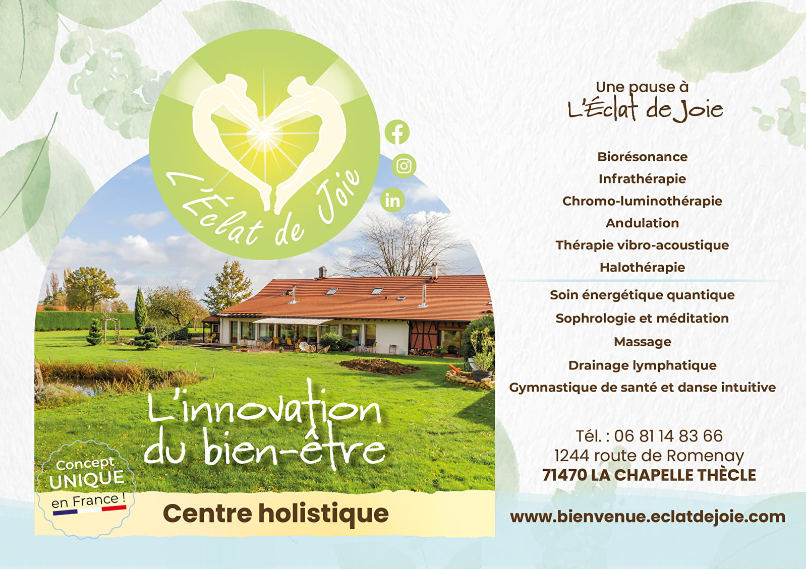 Une pause à L’Éclat de Joie avec : Biorésonance - Chromo-luminothérapie - Thérapie vibro-acoustique - Infrathérapie - Andulation - Halothérapie - Soin énergétique quantique - Sophrologie et méditation - Massage - Drainage lymphatique - Gymnastique de santé et danse intuitive