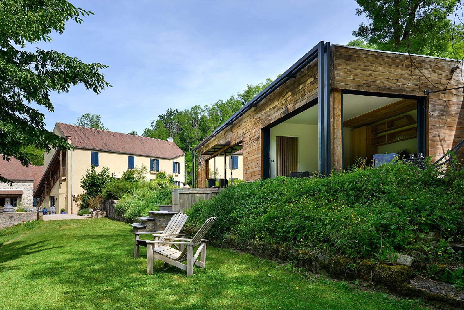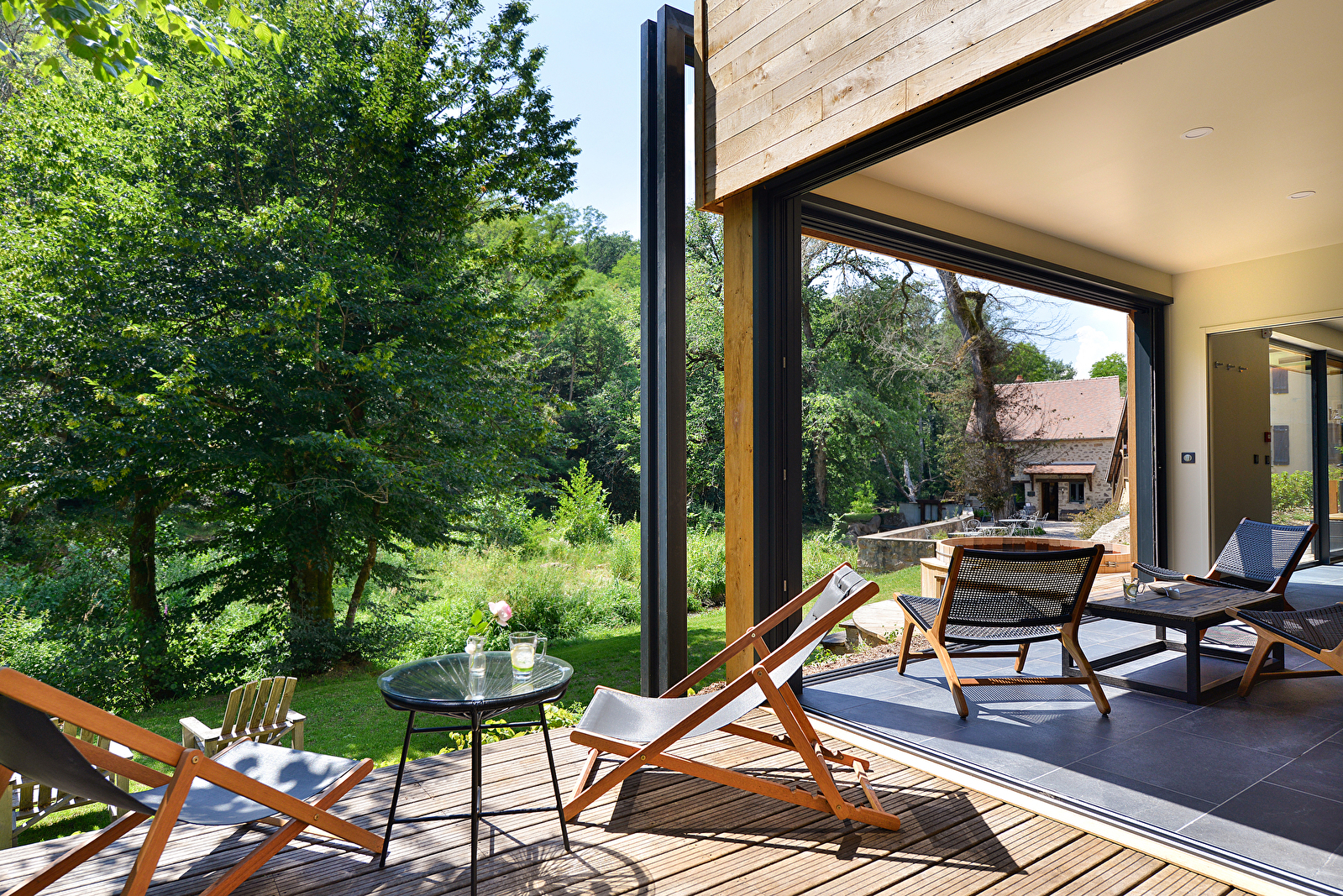 Le bain à remous extérieur est intégré dans l’esprit du lieu pour une connexion absolue avec la rivière et les étoiles.