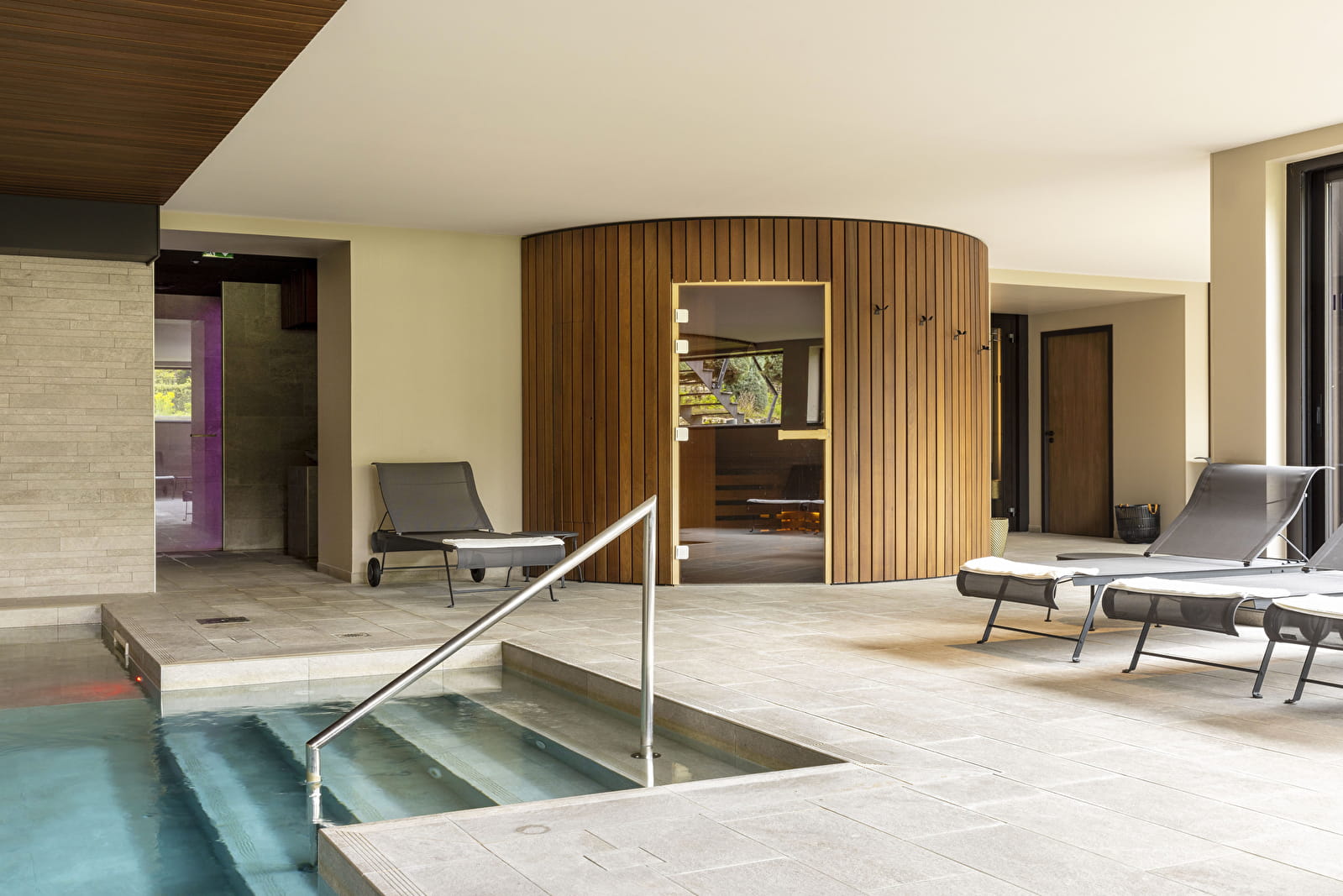 Imaginez de beaux volumes, de très larges baies vitrées qui laissent généreusement entrer la lumière naturelle, une harmonie entre le bois, le verre et la pierre, entre les arrondis et les lignes épurées, des teintes douces. Pénétrez dans cet univers apaisant, immergez-vous dans ce véritable cocon de bien-être au cœur du Jura.