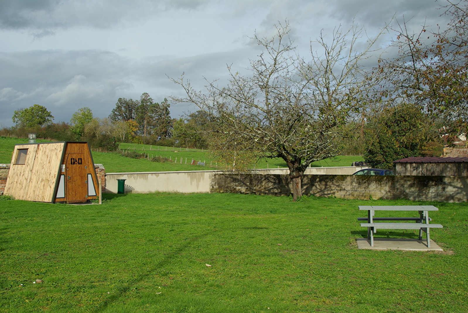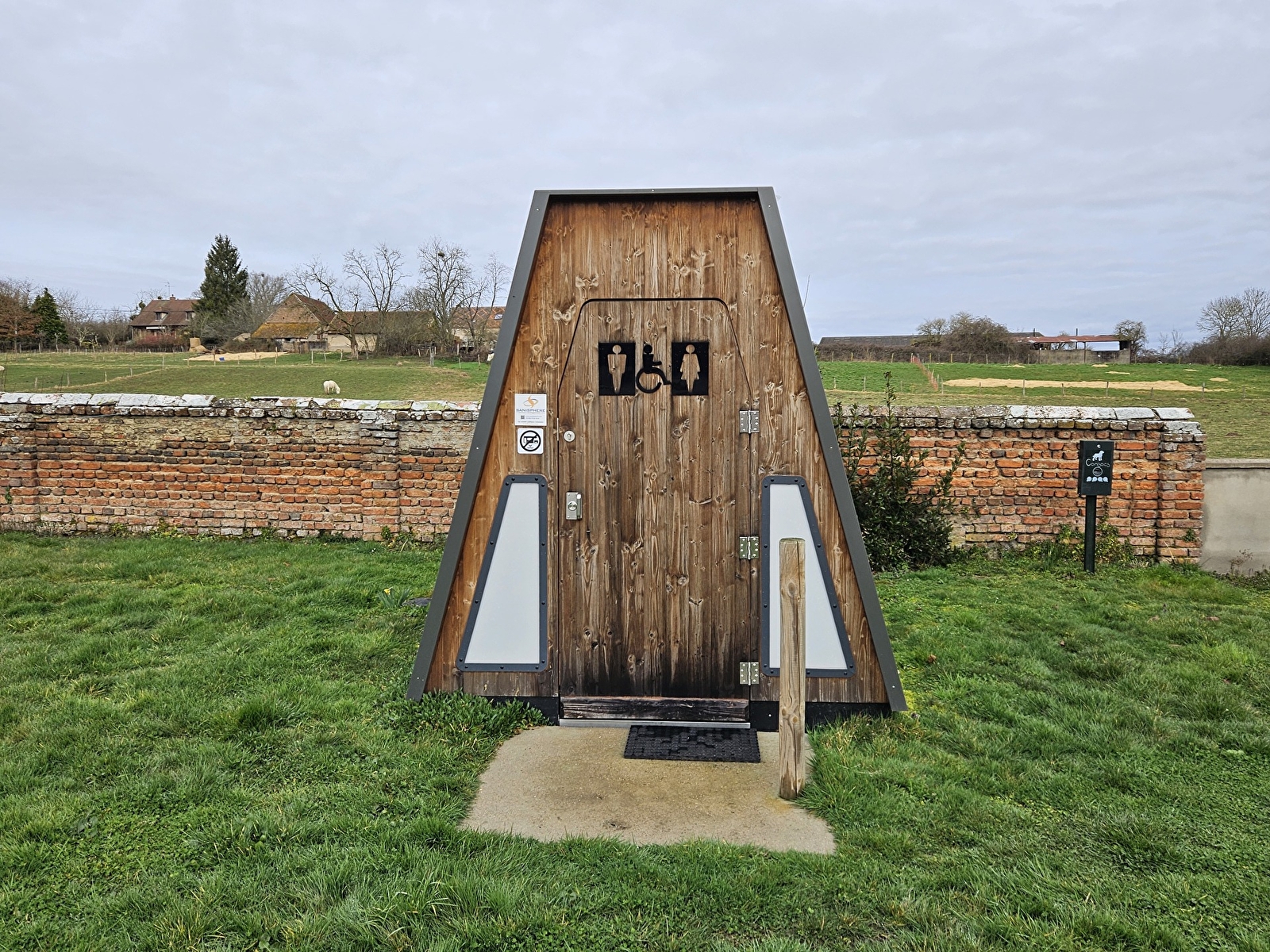 Aire de pique comportant plusieurs tables, wc et une cabane à livres.