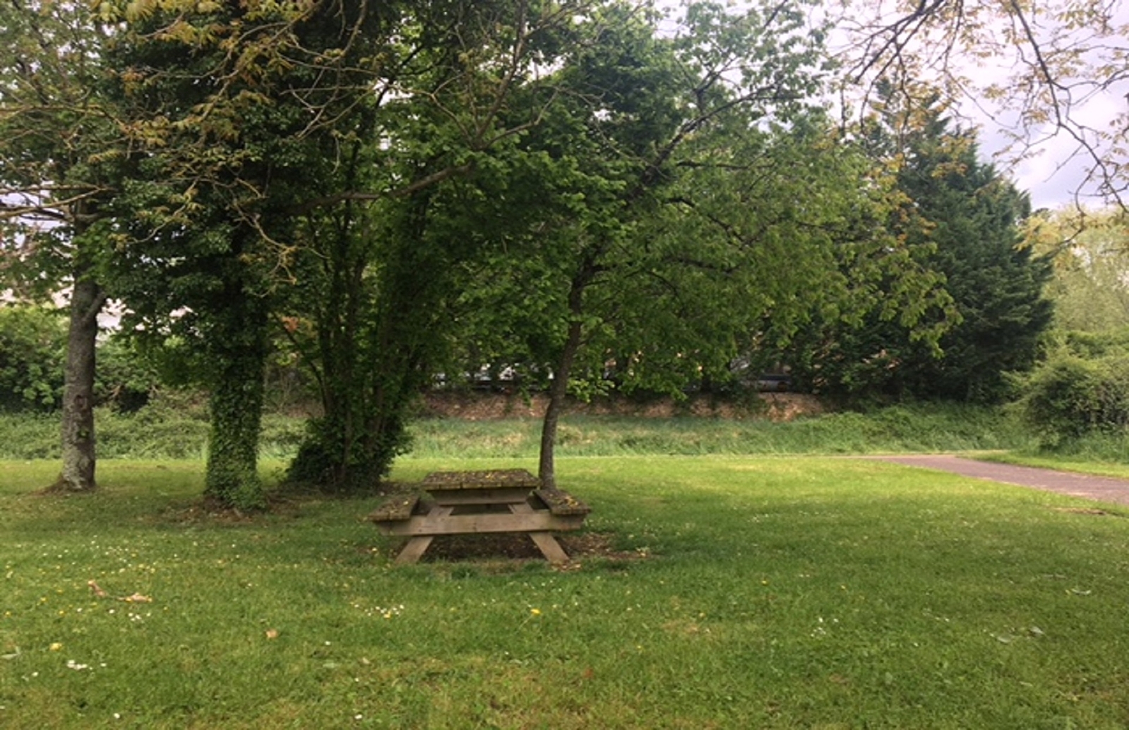 Aire de pique-nique avec table, bancs et sanitaires, le long de la voie verte.