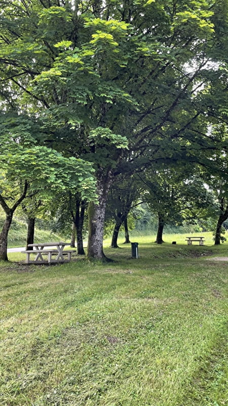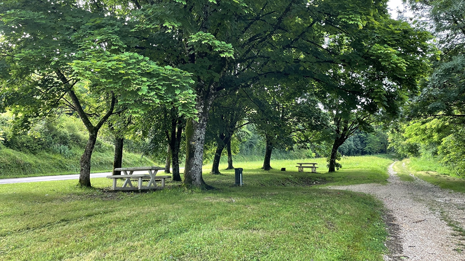 Deux tables de pique-nique ombragées en bord de route à la sortie de Mesnay direction Chilly-sur-Salins.