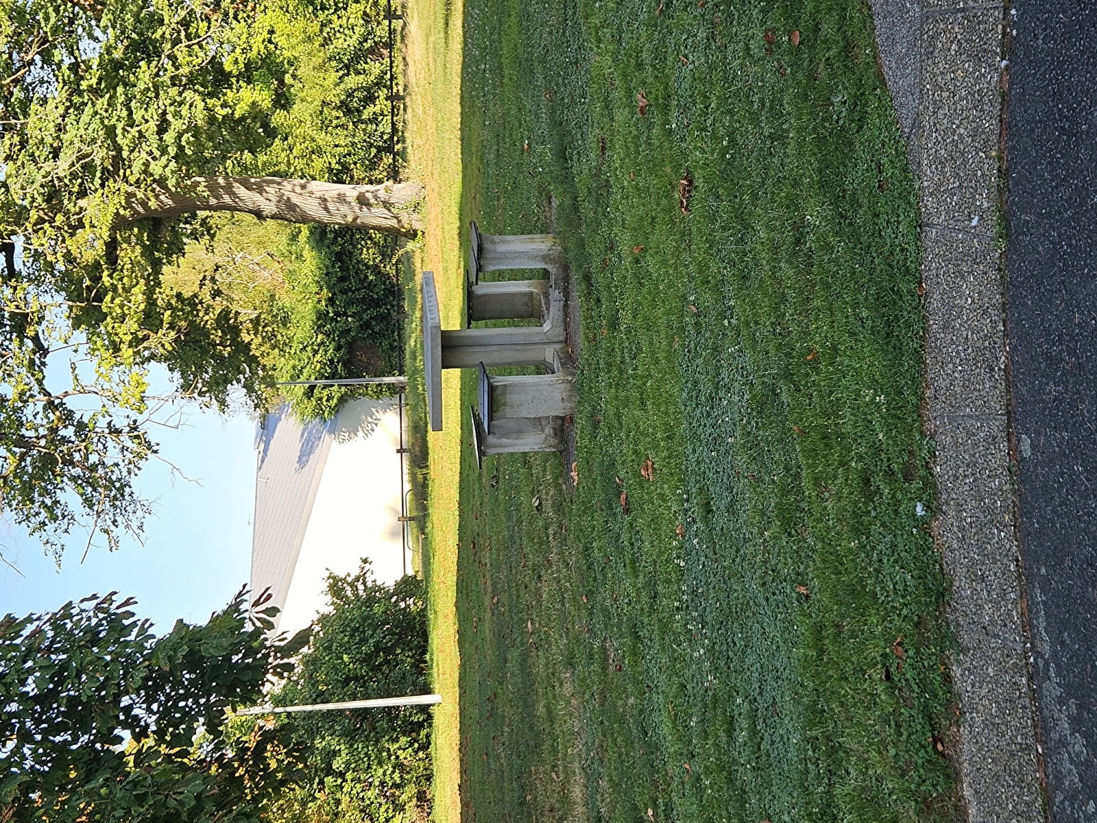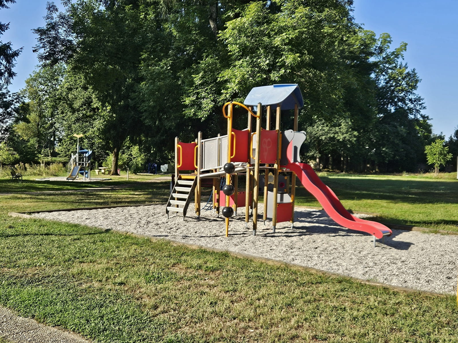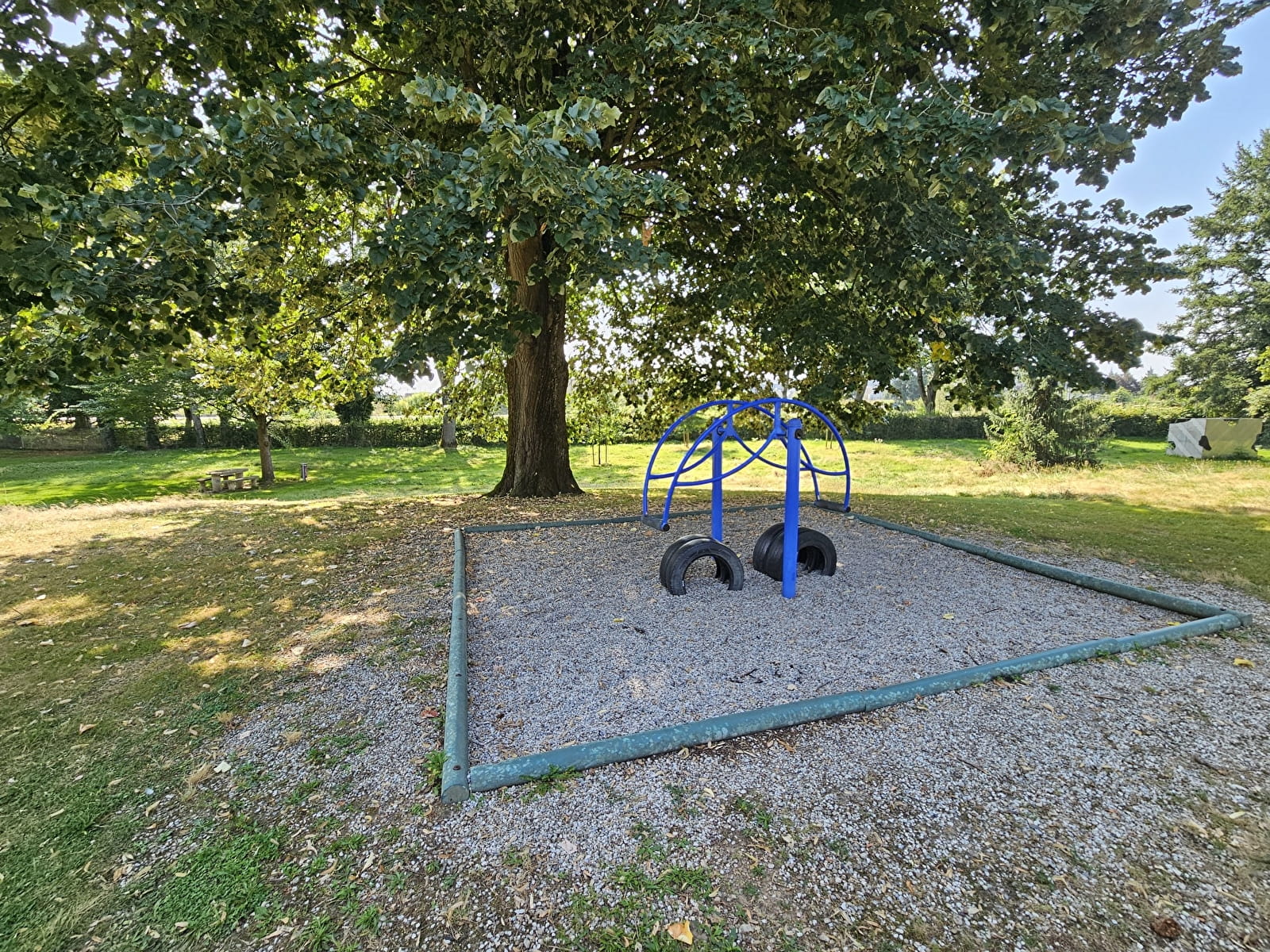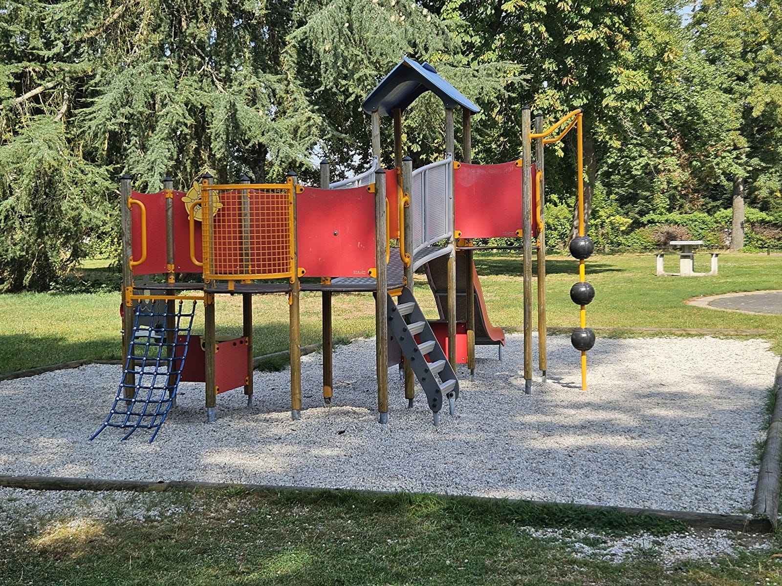Parc avec plusieurs tables de pique nique et jeux pour enfants. Parc fermé à la circulation de véhicules motorisés