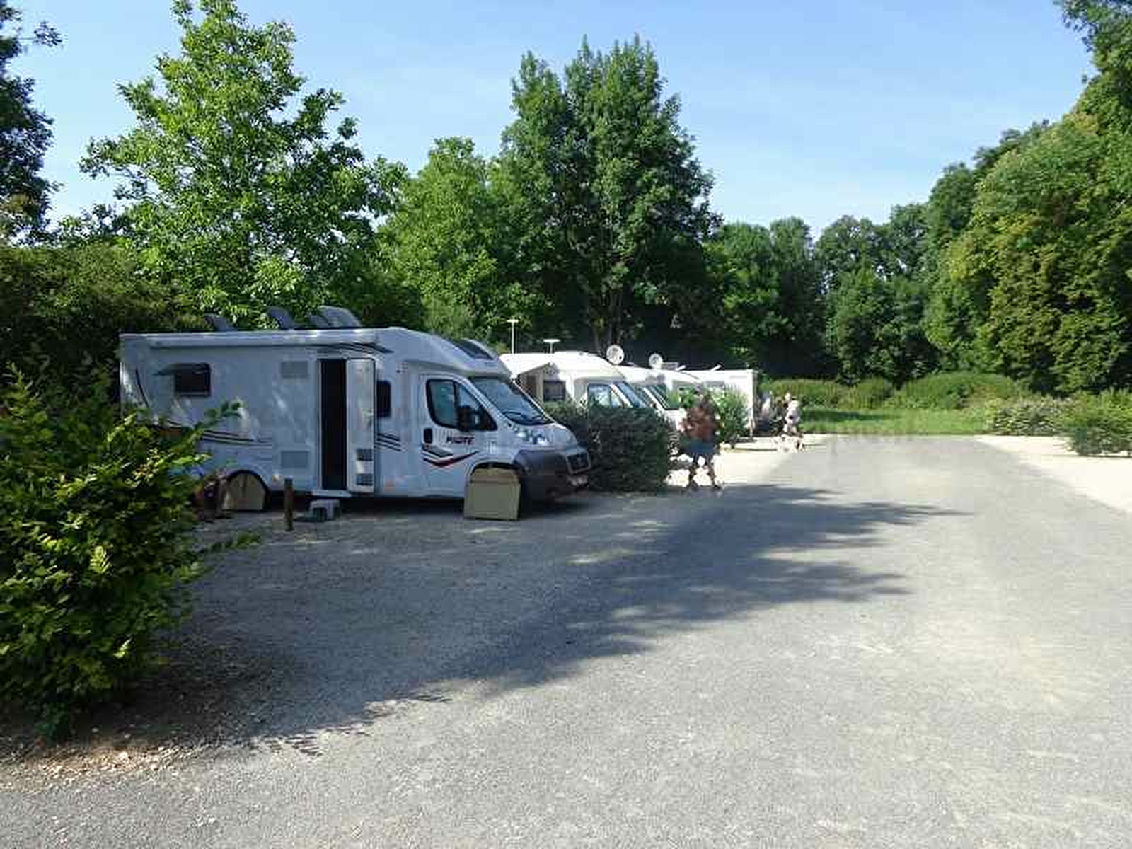 Aire équipée d'un système de vidange (cassettes et eaux usées), 13 places matérialisées avec des séparations par haies ; situé à proximité d'un espace sportif (tennis, terrain de sport, jeux pour enfants). Le centre ville est accessible à pied par ce complexe en longeant le petit ruisseau en bout de stade.