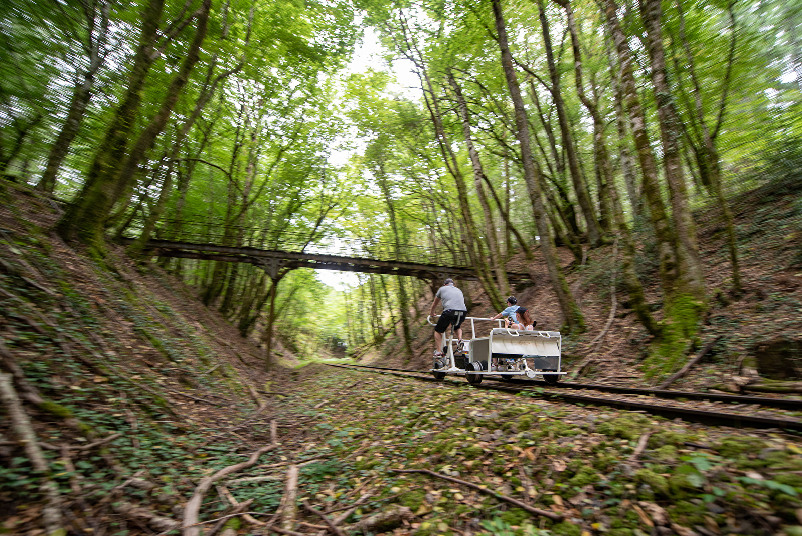 _Petit parcours de la Fontaine d'Amour, 14km aller/retour, 1H45 environ, 39€ par vélorail, 2 personnes minimum par vélo (en capacité de pédaler/freiner, taille mini 1.50m) et 5 personnes maximum par vélorail.