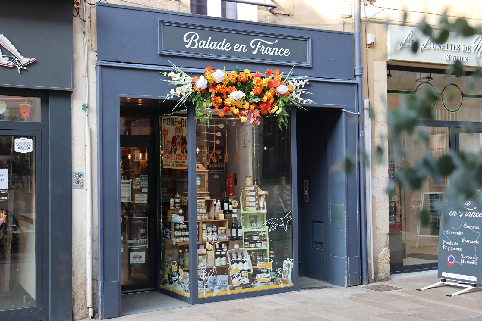 Balade en France est le fruit de 10 ans d'expérience au marché des Halles de Dijon. Nous proposons une sélection de produits régionaux français, d'épicerie fine et d'objets cadeaux. Vous y trouverez la gamme complète des moutardes Reine de Dijon, 100% graines de France et sans conservateurs depuis 1840, les cassis et liqueurs Briottet, les fameux Anis de Flavigny, les savons de Marseille aux multiples usages, ainsi que les objets en bois des Tabletteries des Lacs (Jura).