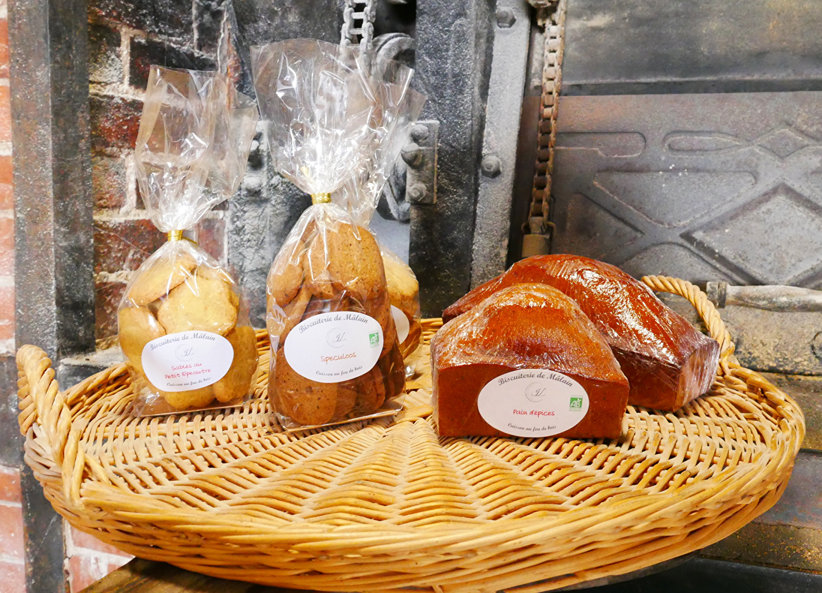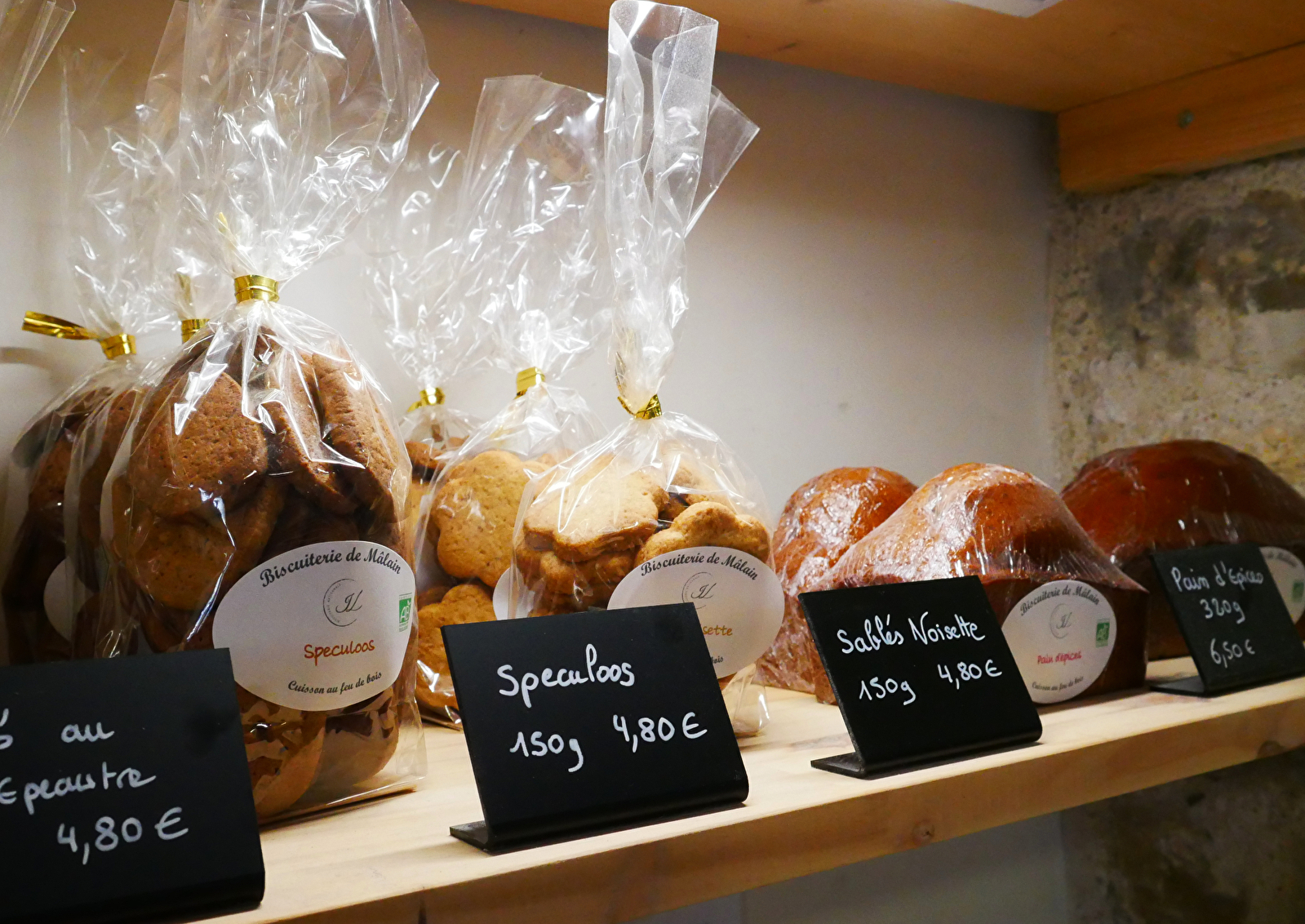 Chaque semaine, la biscuiterie vous propose différentes gourmandises élaborées à partir de farines paysannes produites à Mâlain, puis cuites au feu de bois : biscuits sablés au petit épeautre, pains d'épices, speculoos, croquants aux amandes, sablés noisette...