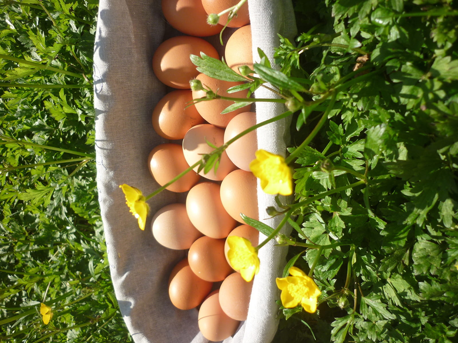 Exploitation agricole avec une culture de maraîchage de légumes de saison (culture sans produits chimiques), blettes, épinards, tomates, salades, courgettes, concombre, haricots, betteraves rouges, poireaux, courges, choux rouges et verts, et une petite production d'oeufs de poules élevées en plein air.
