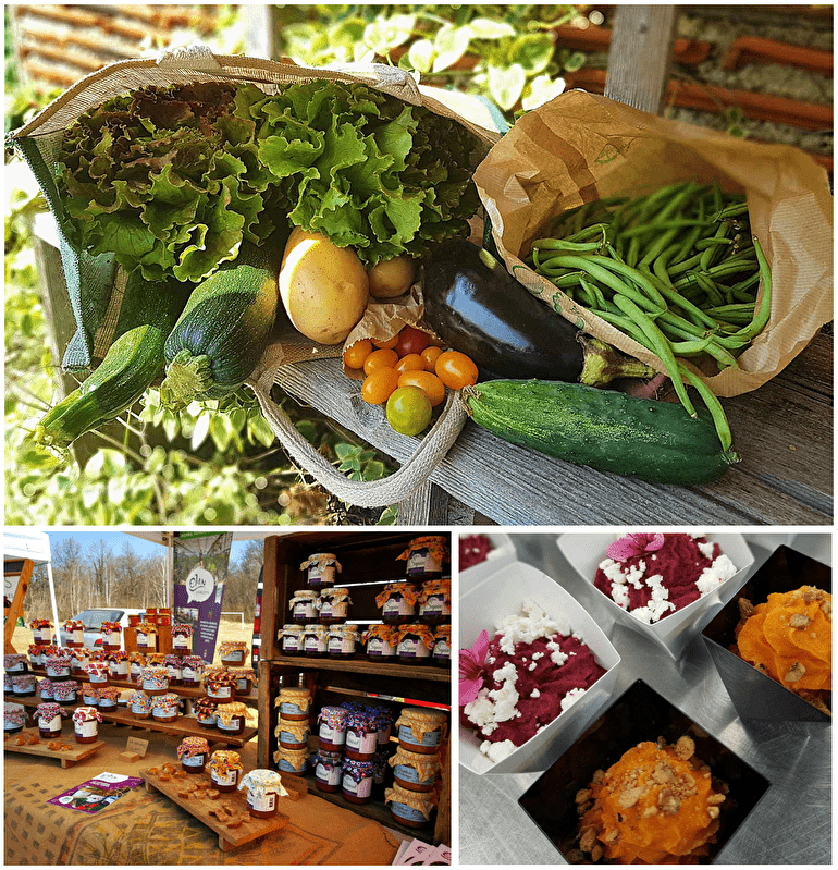 Paniers de légumes bio, frais, locaux et de saison, livrés sur 26 points de dépôt dans le Jura et au marché de Lons-le-Saunier, Biocoop et Marché Paysan (formule sans engagement). Confitures, gelées et bocaux salés bio produits à partir de fruits sauvés chez les particuliers, de cueillettes sauvages et de nos surplus de récoltes. Valorisation en bocaux de surplus de récoltes des maraichers de la région. Réalisation de buffets végétaux et colorés pour les événements d'entreprises, collectivités, associations... Présence sur le marché de Bletterans le mardi et le marché de Lons-le-Saunier le jeudi.