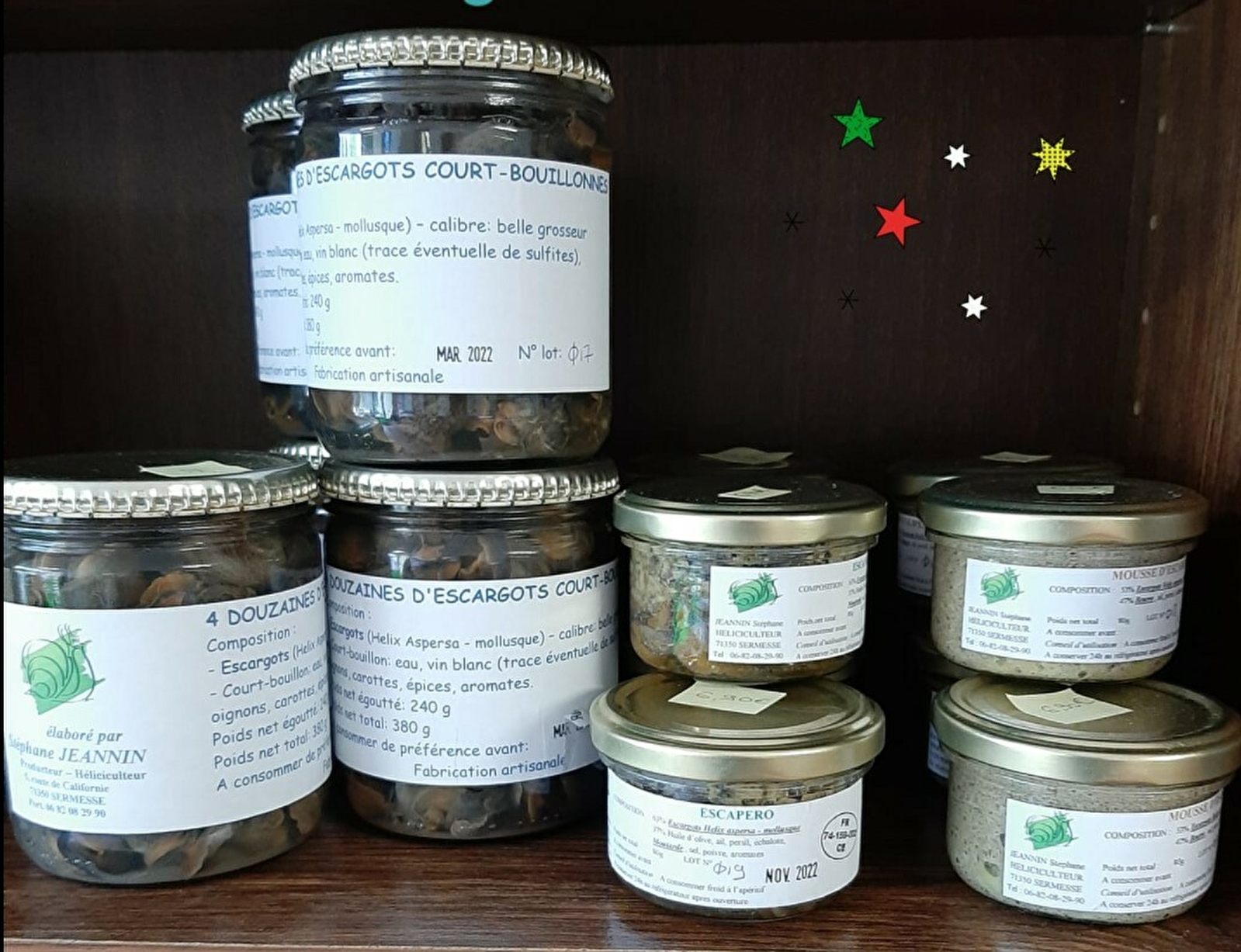 Stéphane élève et vend des produits à base d'escargots, coquilles et croquilles à la bourguignonne, escapéros, mousses d'escargots... Actuellement en cours d'installation, vous pouvez le rencontrer sur des marchés régionaux, ou en livraison à domicile dans un rayon de 20km autour de Sermesse.