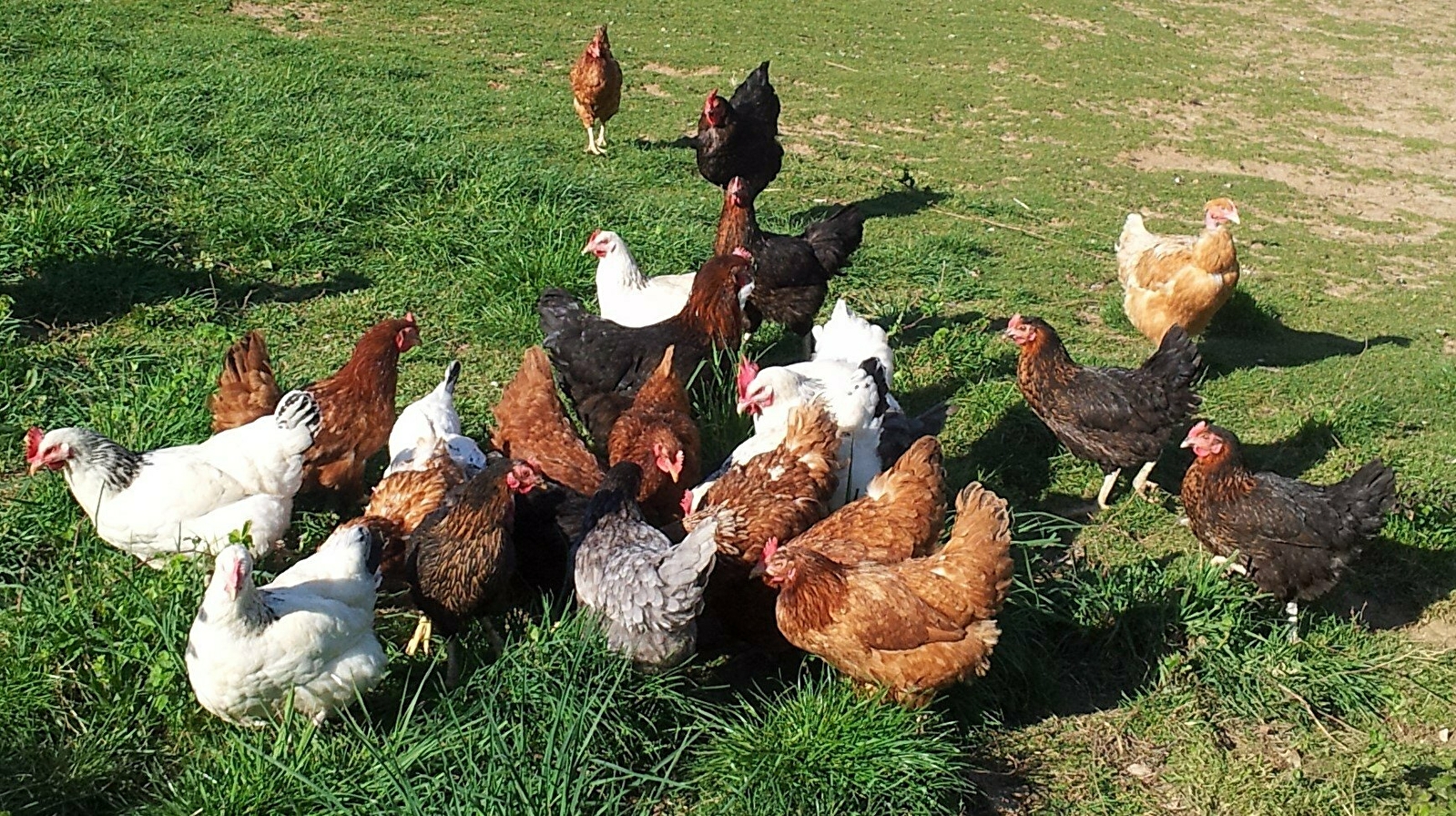 Élevage de volailles en plein air nourries sans OGM et sans antibiotiques.