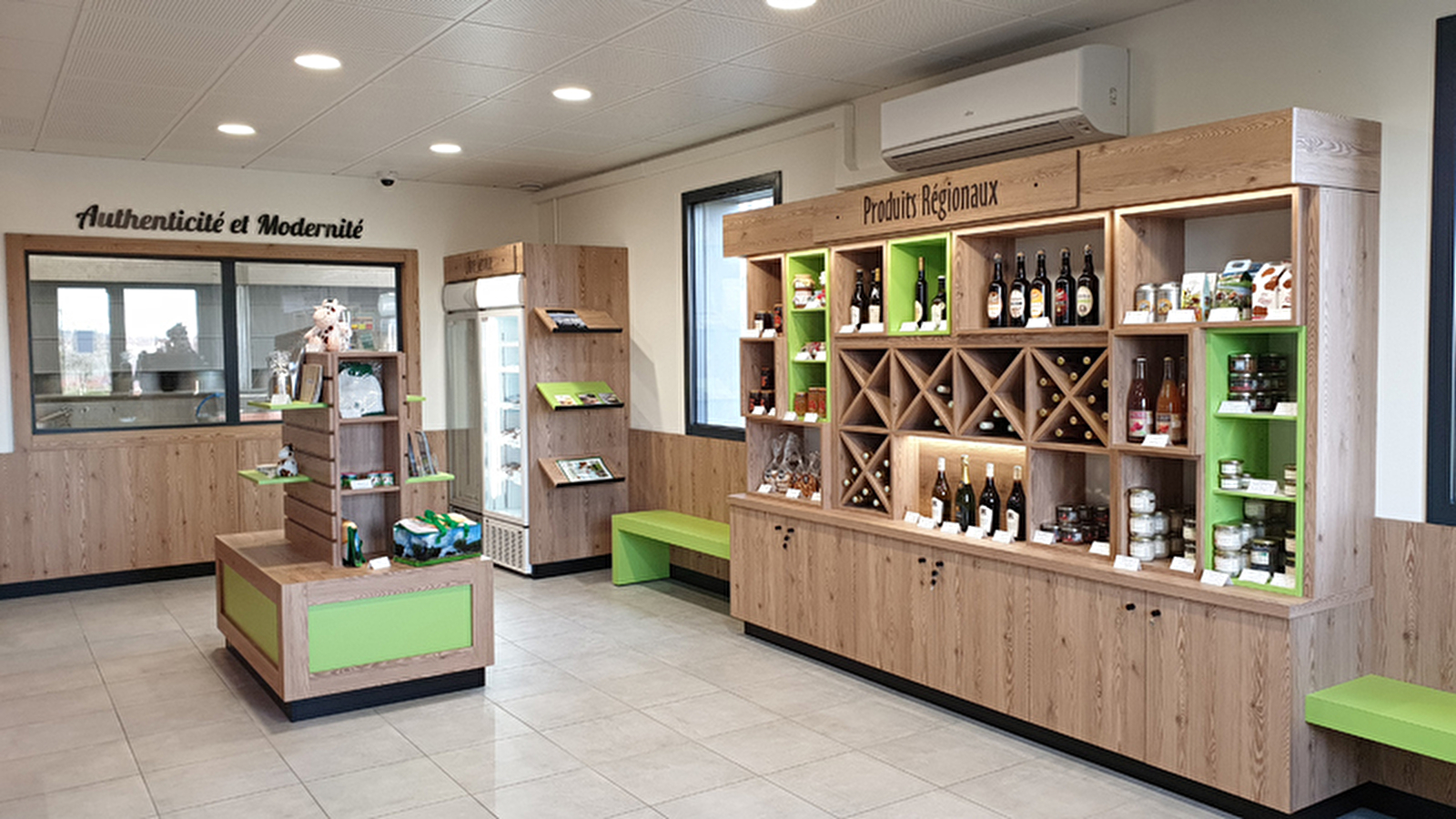 Pour les accompagner, une sélection de salaisons et de boissons locales complètent la boutique. Un plus : la vue panoramique sur la salle de fabrication depuis le magasin, qui permet ainsi aux visiteurs d'admirer le savoir-faire des fromagers.