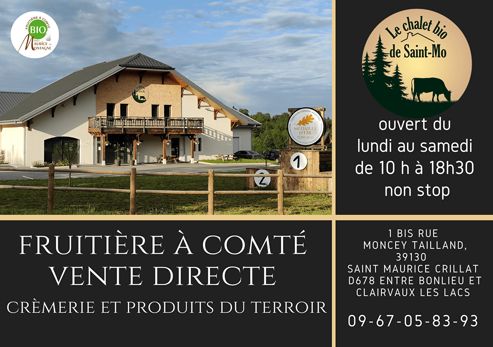 Fabrication de comté bio, différents affinages, doux, fruité, grande réserve, mais aussi morbier, raclette, beurre, crème, faisselles le tout en BIO également. Pour gagner du temps, vous pouvez passer commande par mail ou sms et venir ensuite récupérer votre commande en magasin. ouvert du lundi au samedi de 10 h à 18h30
