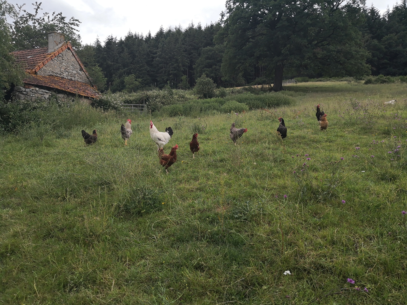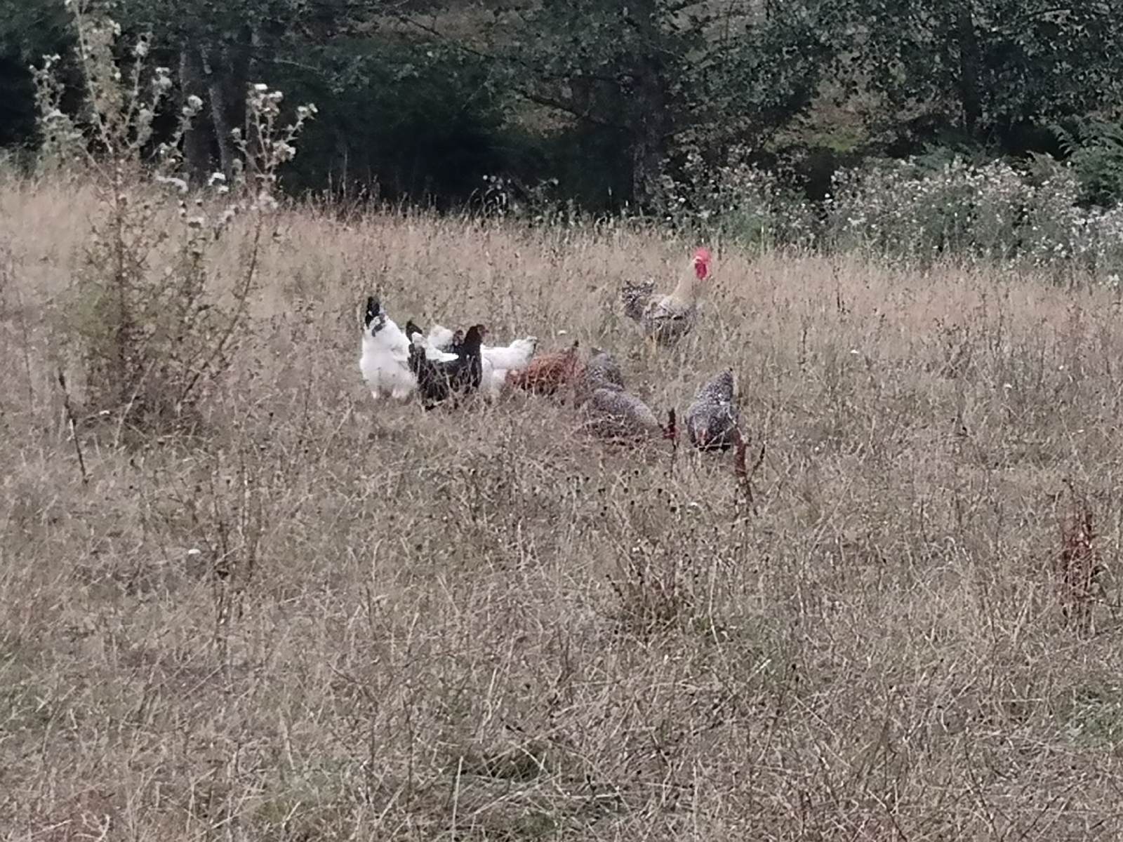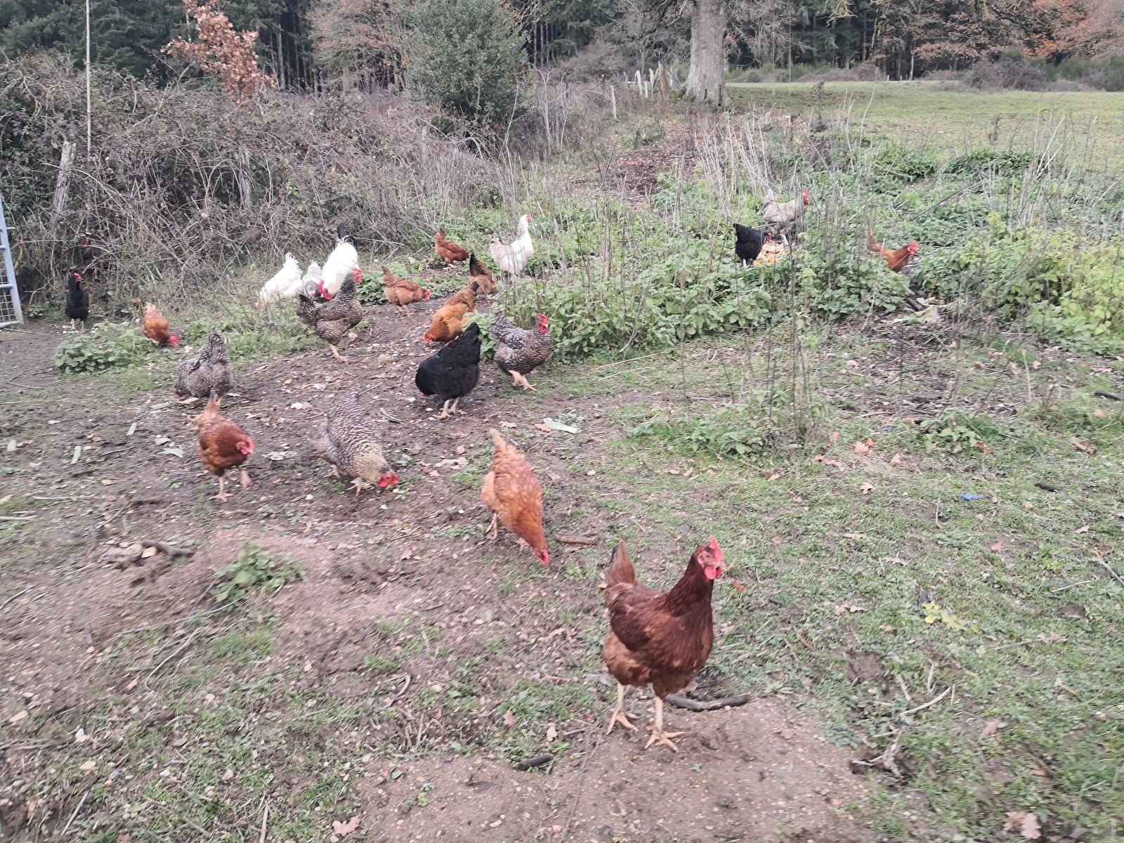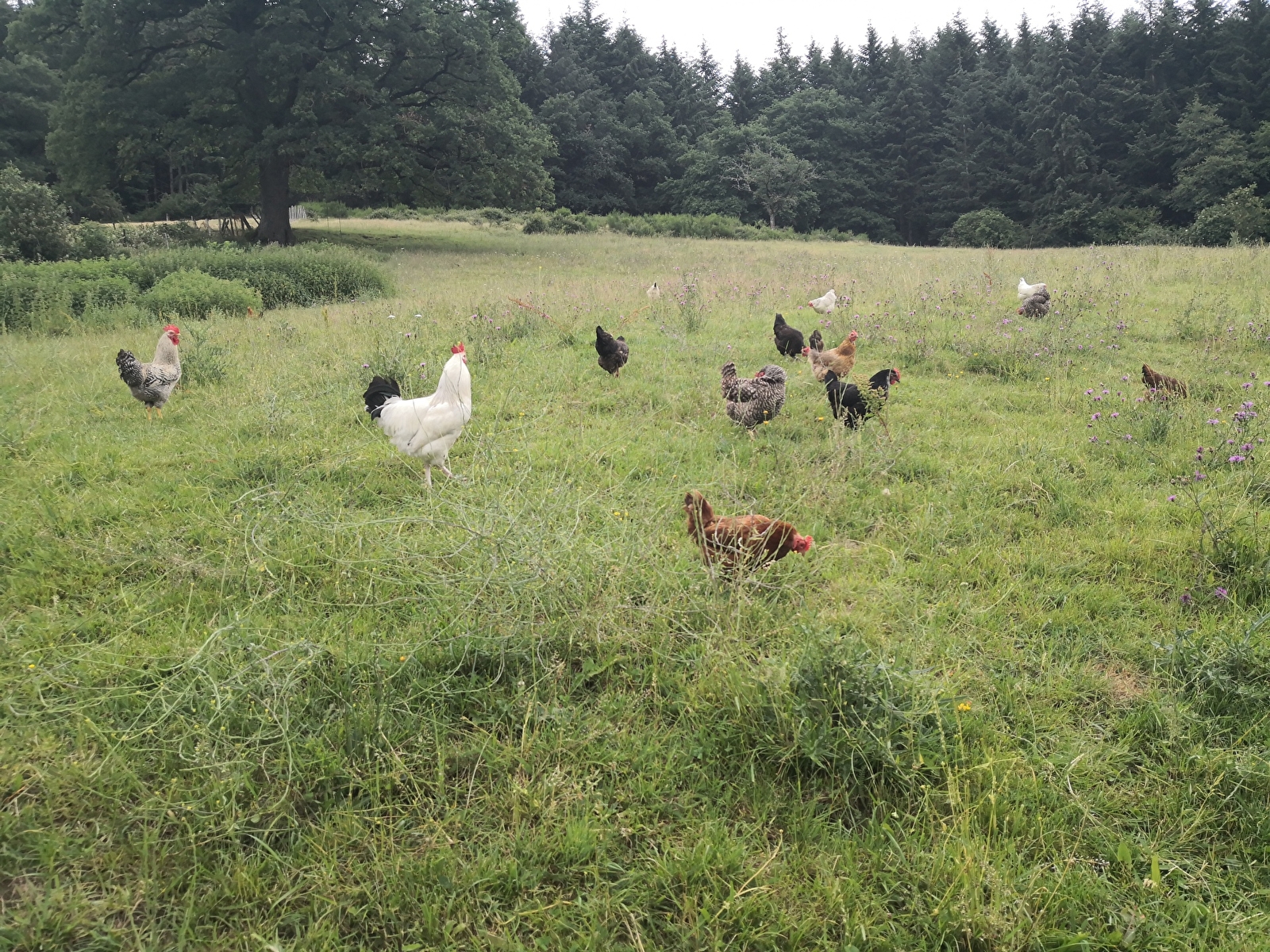 Nous avons une cinquantaine de poules pondeuses. Elles peuvent se déplacer en liberté dans nos prés et gratter le sol. Elles trouvent à manger partout.