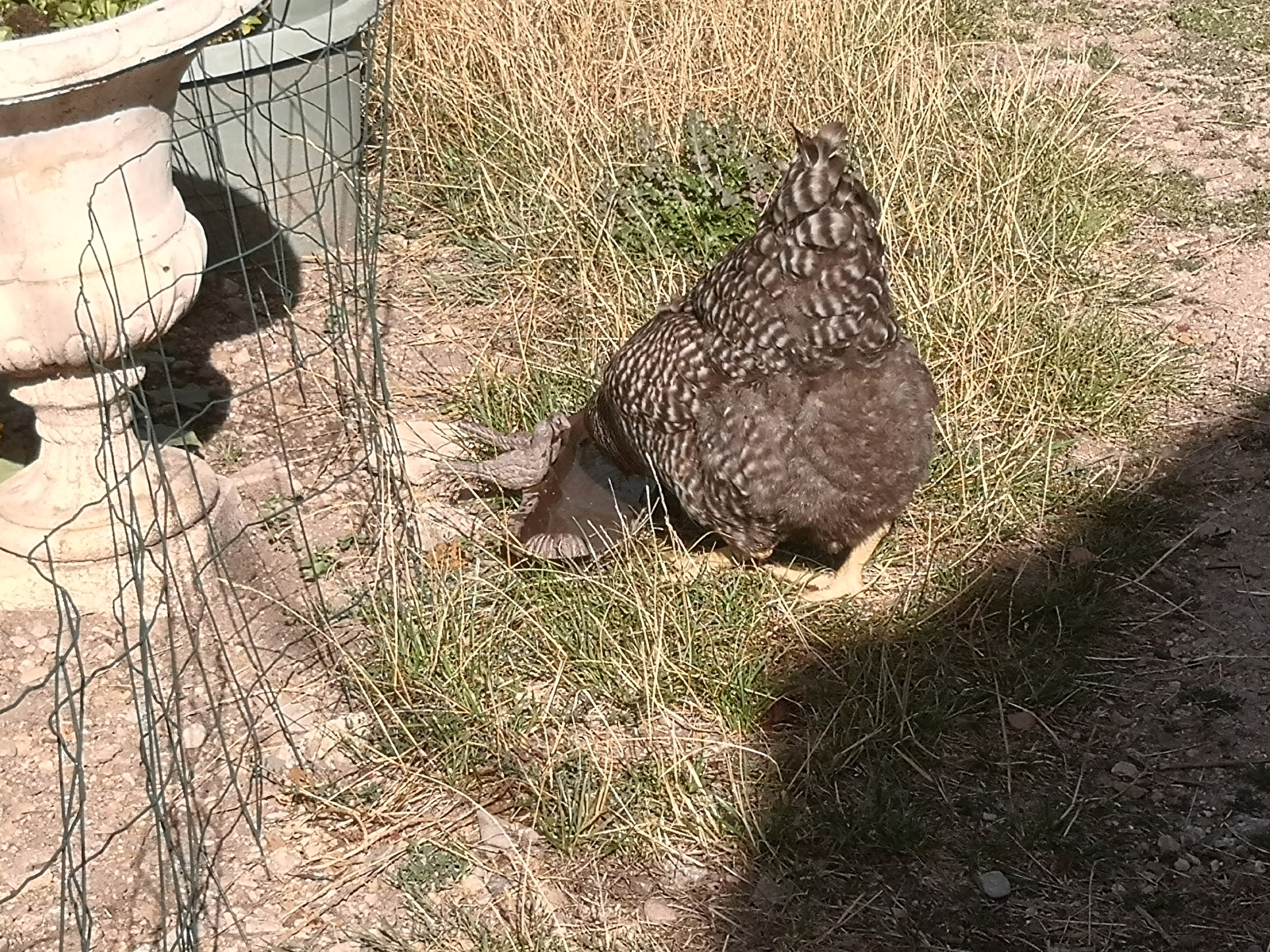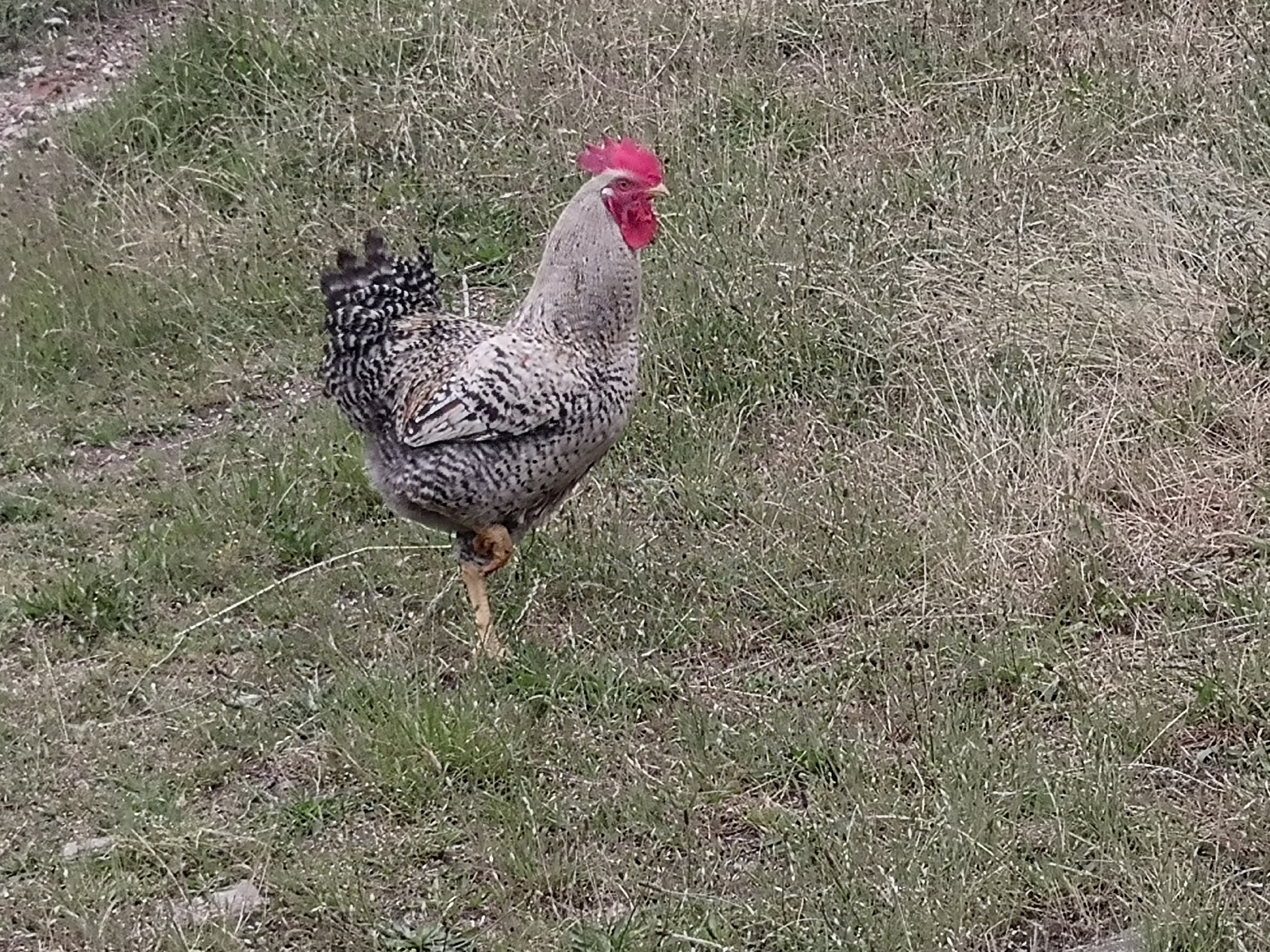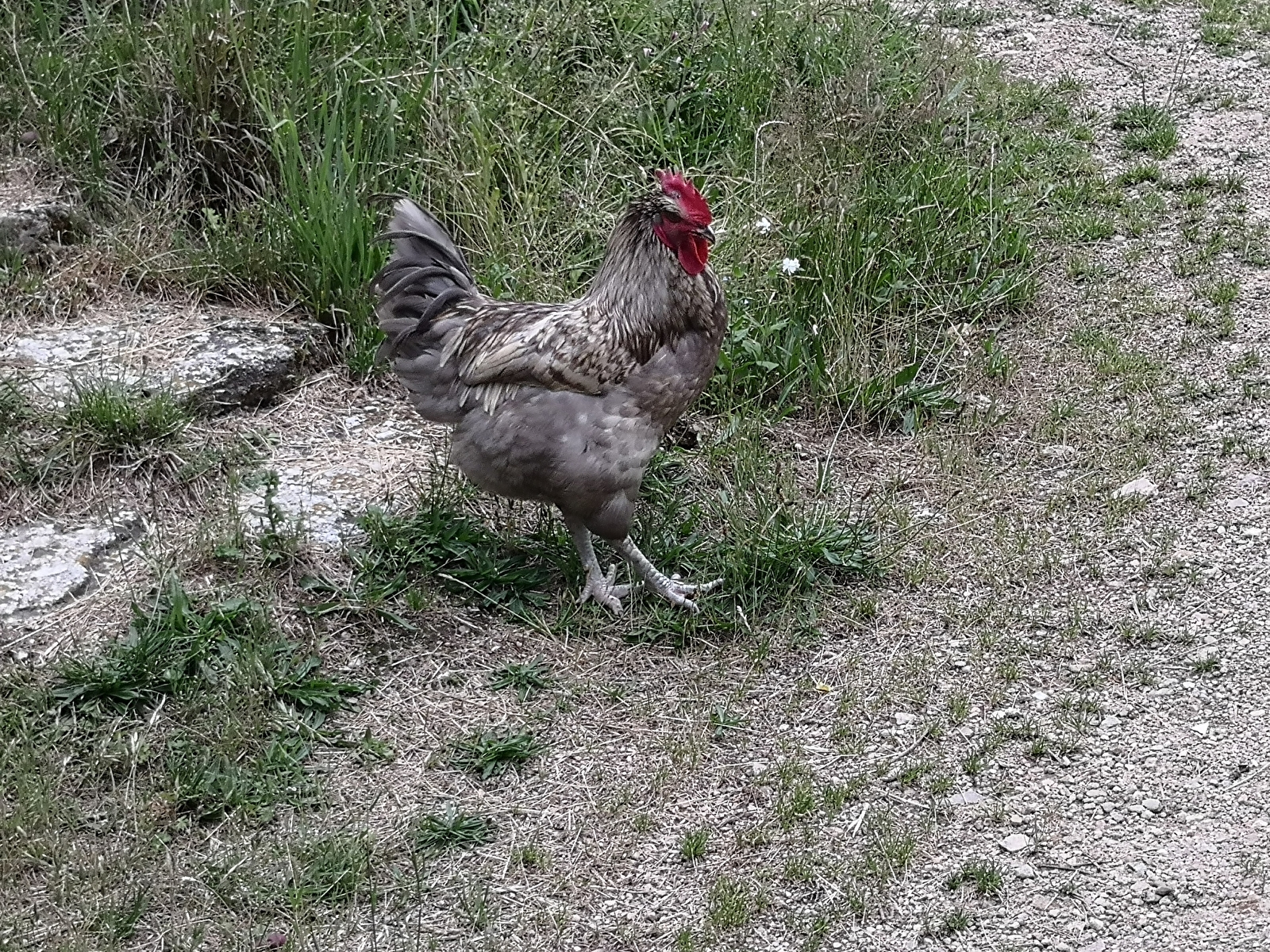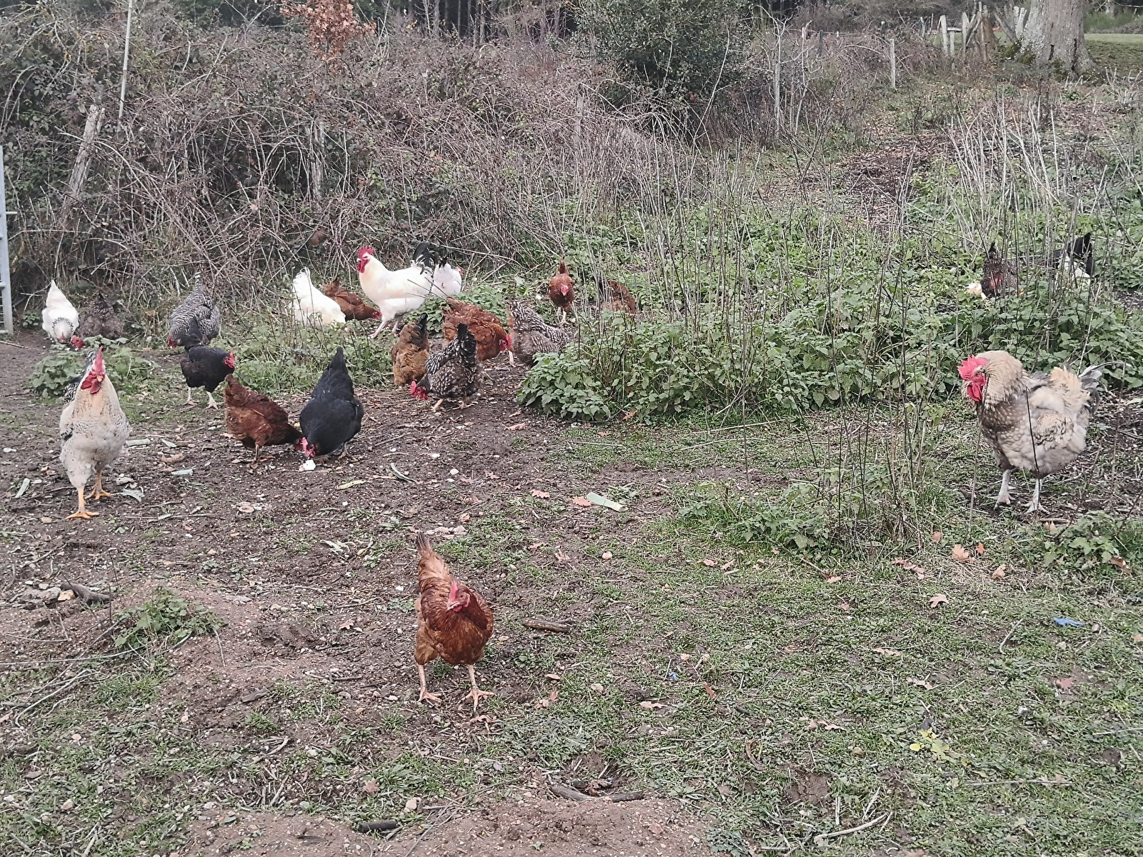 Nous avons une cinquantaine de poules pondeuses. Elles peuvent se déplacer en liberté dans nos prés et gratter le sol. Elles trouvent à manger partout.