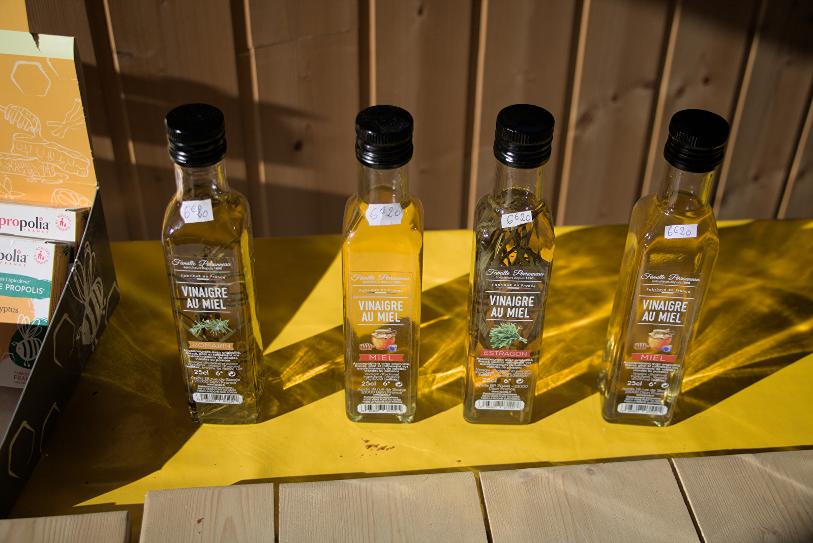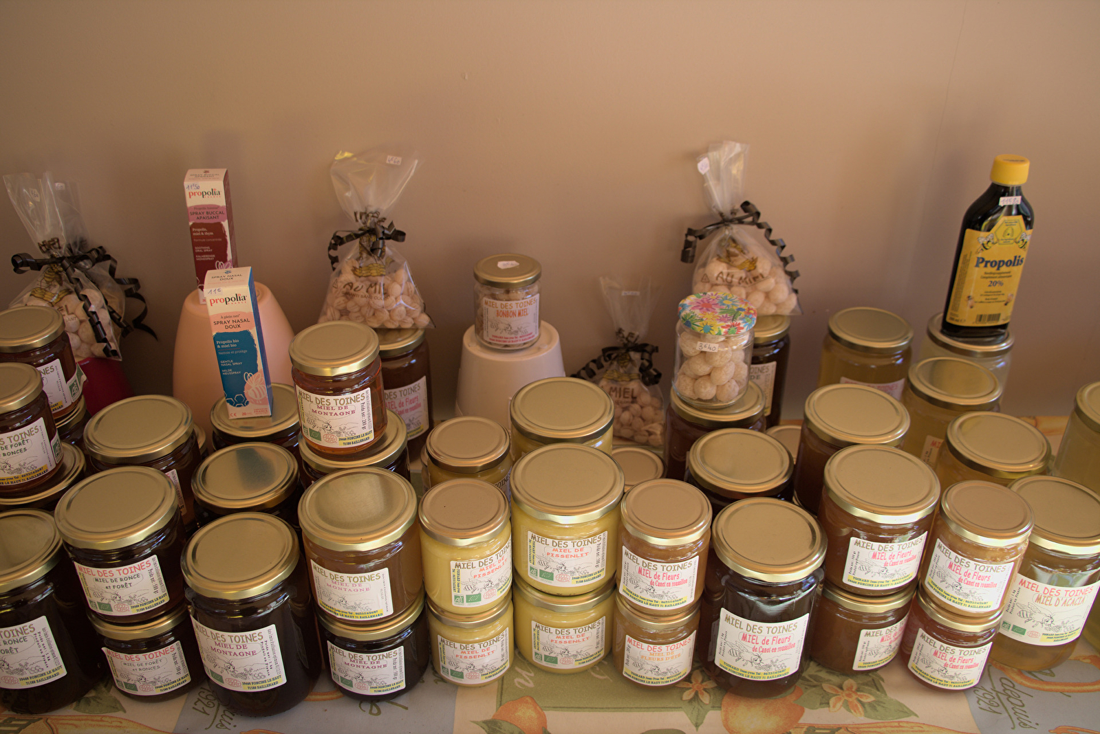 C’est ainsi qu’au Miel des Toines, ce ne sont pas moins de neuf variétés différentes, uniquement récoltées dans le Jura, qui enchanteront vos papilles : miel de printemps, crémeux et fruité ; miel d’acacia, très doux ; miel de ronce aux notes de mûres ; miel de pissenlit aux vertus digestives ; miel de tilleul, très parfumé ; miel de montagne, riche en minéraux et vitamines ; miel de sapin très puissant… et les plus rares miel de framboise et miel d’érable. Chacun trouvera son bonheur parmi ces nectars jurassiens, disponibles en pots de 500 g ou… ou du double pour les plus gourmands !