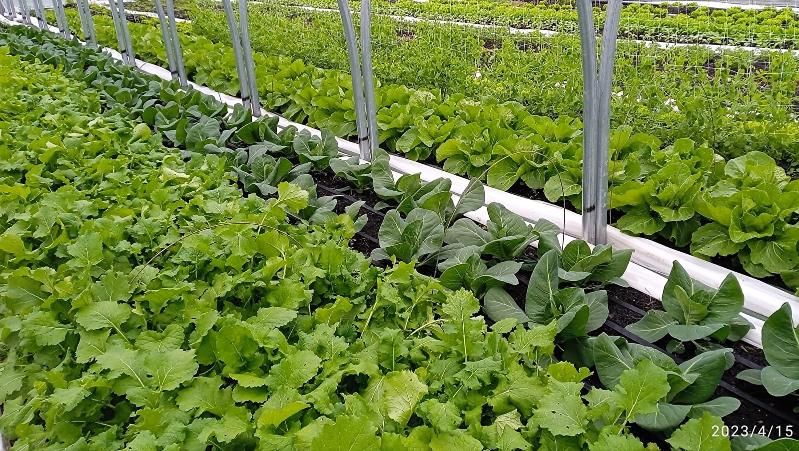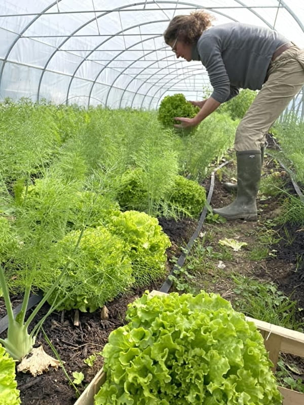 Nous travaillons le sol en planches permanentes, et quelques jardins sont cultivés en maraîchage sur sol vivant. Pour fertiliser, nous apportons 30 tonnes de compost par an et alternons nos cultures avec des semis d'engrais verts, car nous nous orientons de plus en plus vers un maraichage respectueux de la terre et de la vie du sol. Pour protéger les cultures des ravageurs, nous installons des filets anti-insectes. Le but est d'apporter à nos clients des légumes sains, nutritifs, et produits localement.