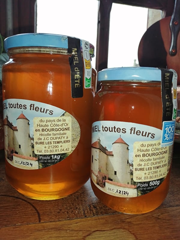 Vente de miel de production familiale, pots de 1 kg et 500 g , récoltes printanière et estivale. Label - Marque "Savoir faire 100 % Côte d'Or"