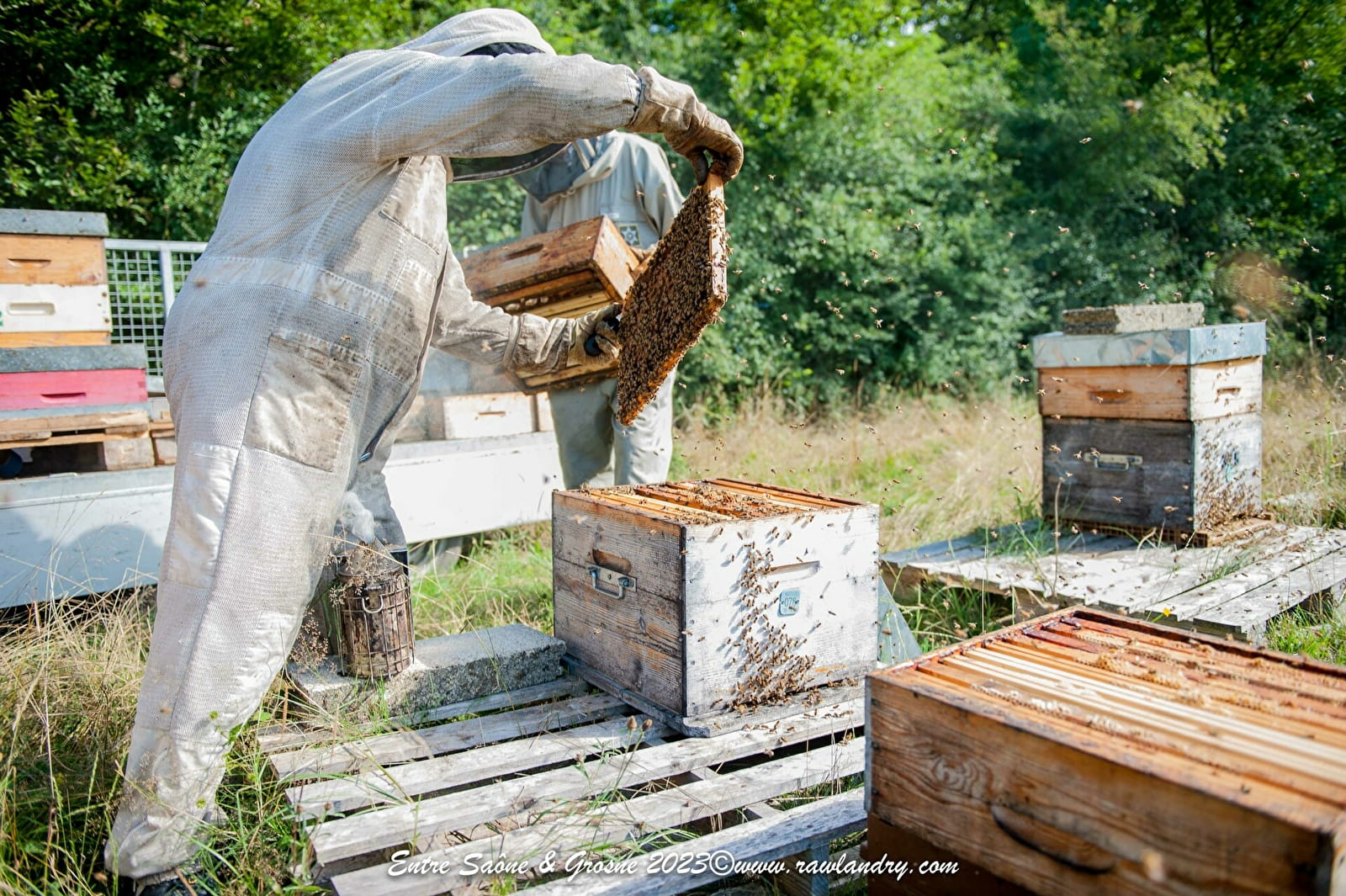 Nous produisons 9 miels aussi différents en couleur qu’en goût grâce à la transhumance en Saône-et-Loire et dans le Jura. Le miel est extrait à froid grâce à une centrifugeuse.