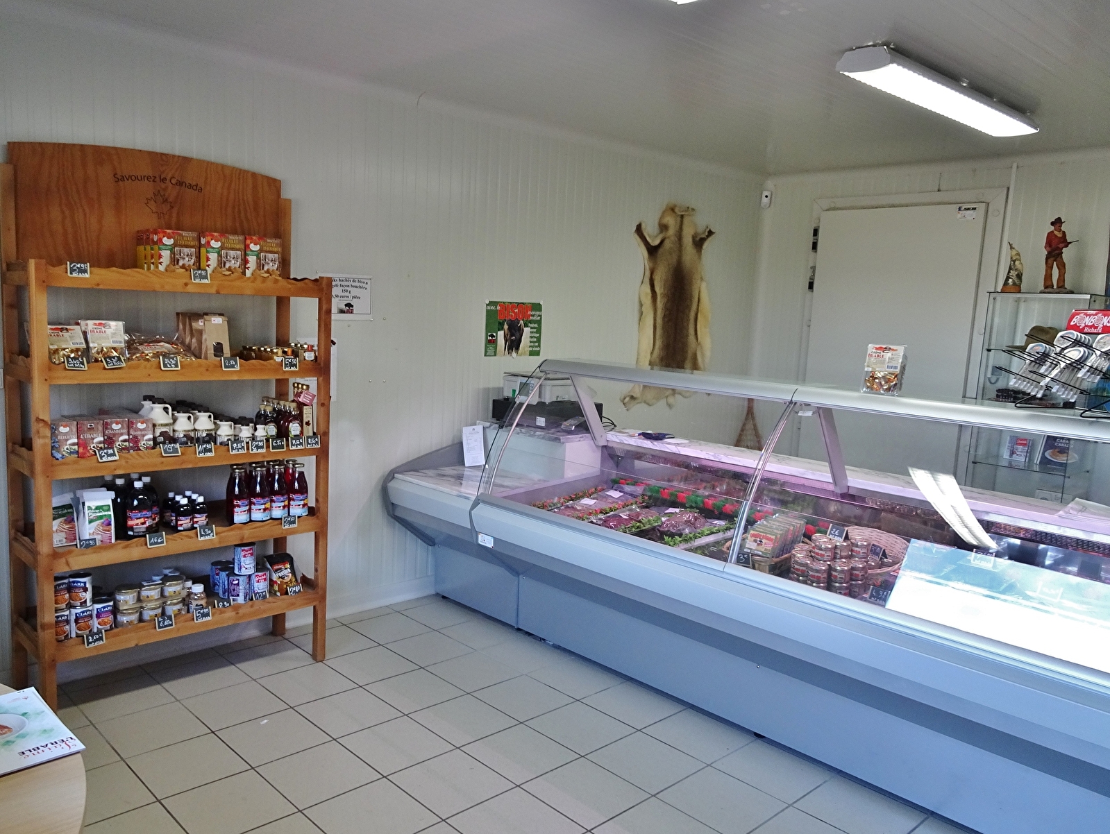 Vente de viande de bison, terrines, saucisson et produits canadiens (sirop d'érable, bières...).