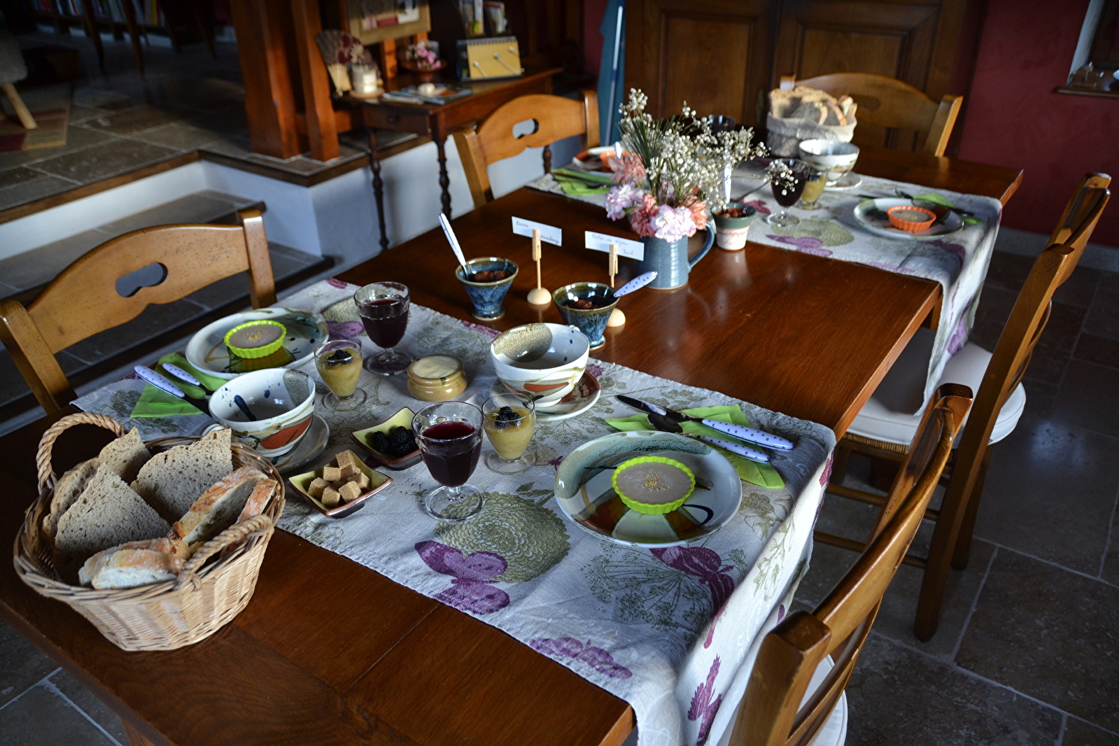 Nous partagerons le petit déjeuner en terrasse ou dans notre salle à manger autour de nos productions maison : confitures, compotes, sirops et pâtisseries.