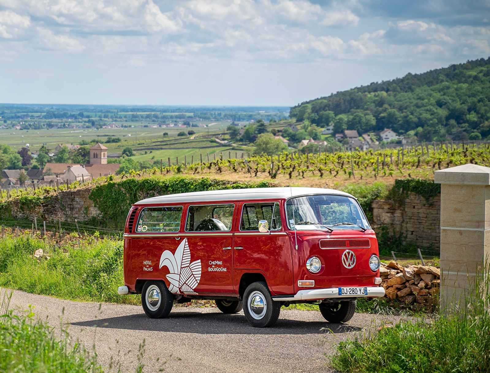 « Embarquez pour un circuit à bord de notre Combi T2 de 1970, sur la route des grands crus de la Côte de Nuits entre Chambertin et Romanée-Conti. Parcourez les vignes pour une expérience originale en mode 70s’ !