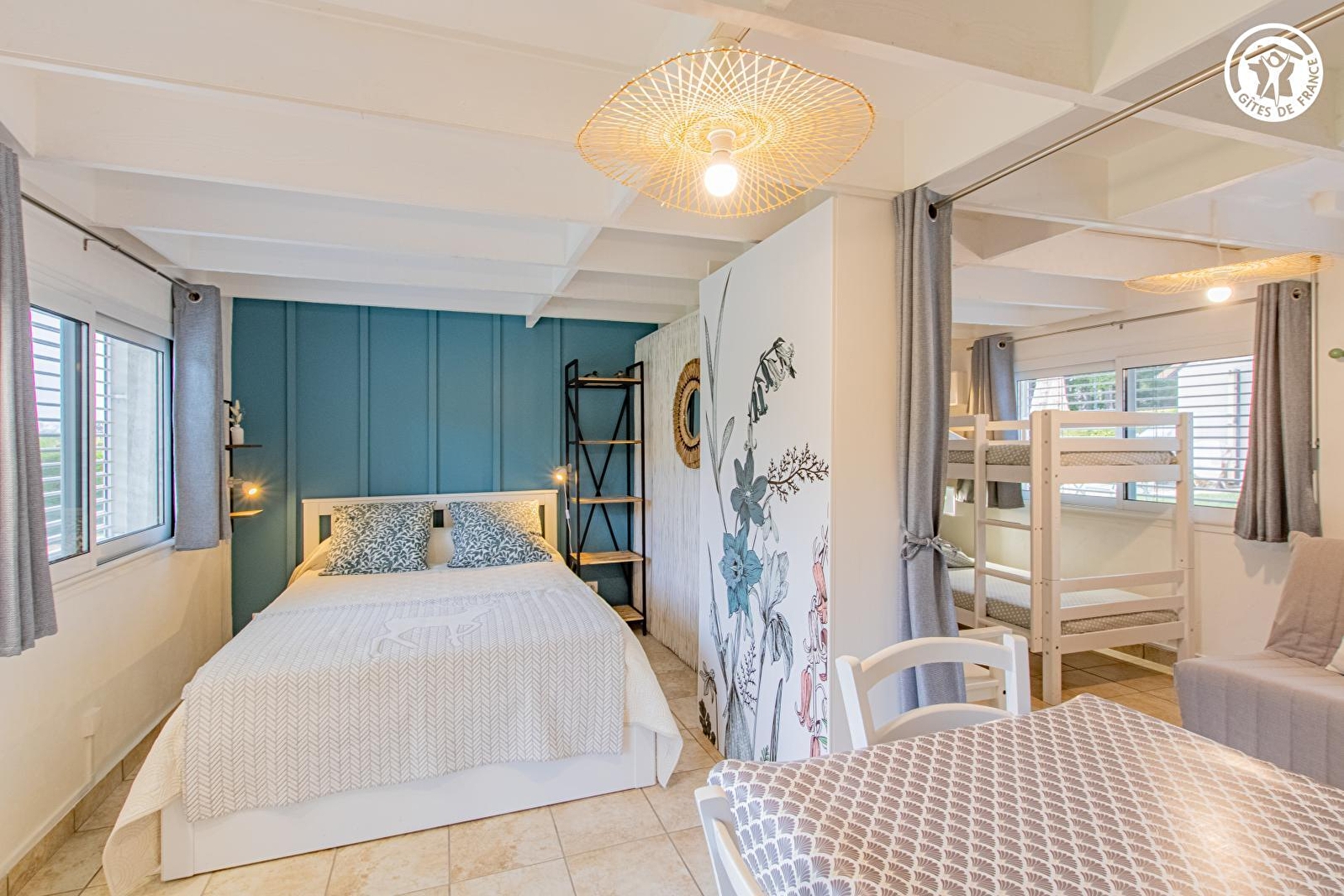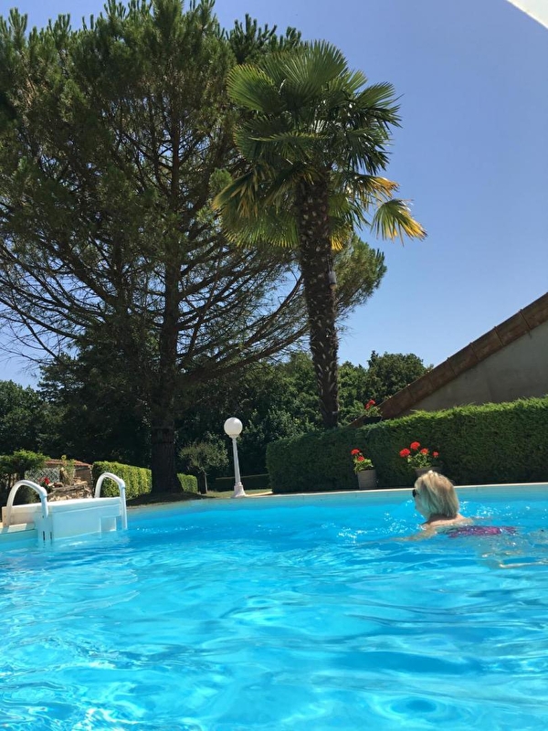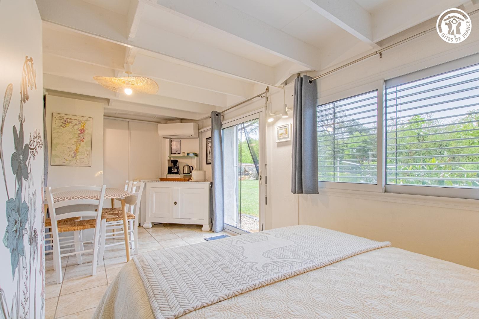 Composition : 2 appartements d'hôtes en accès totalement indépendant avec coins cuisine équipés et terrasses privatives. Chauffage PAC. Climatisation. Wifi (fibre). 1 chambre au rdc d'une aile de la maison des propriétaires (lit 2 p. 140x200cm) avec salle d'eau privée (douche/wc). 1 chambre au rdc d’un petit pavillon indépendant jouxtant la maison des propriétaires (lit 2 p. 140x200cm + 2 lits 1 p. de 90x190cm superposés) avec salle d'eau privée (douche/wc). Jardin clos avec portail électrique (2500m²). Piscine chauffée (8x4m). Parking privé. Local vélos. Petits déjeuners servis dans les chambres en horaires libres. Commerces 4 km. Restaurant 2 km.