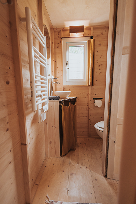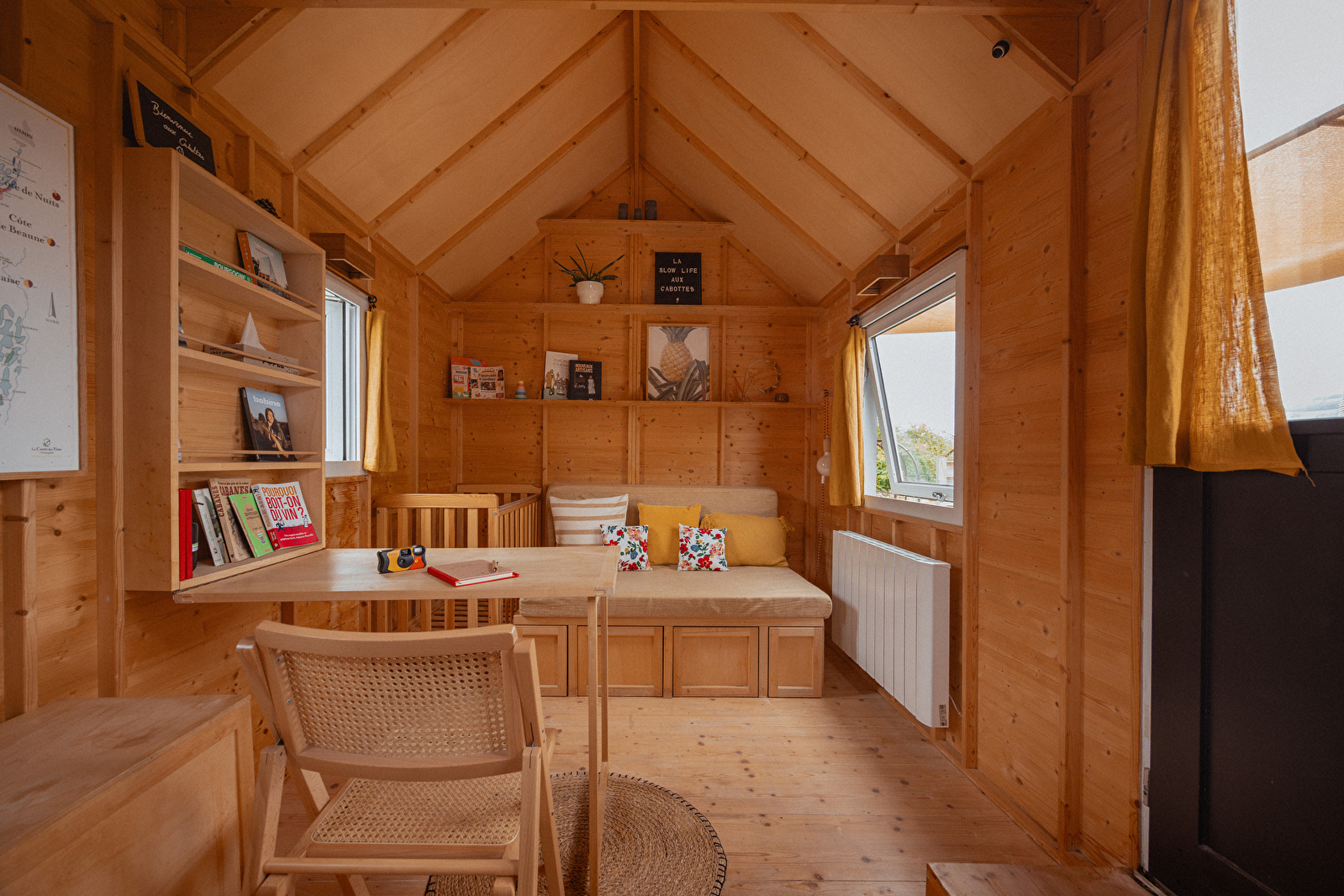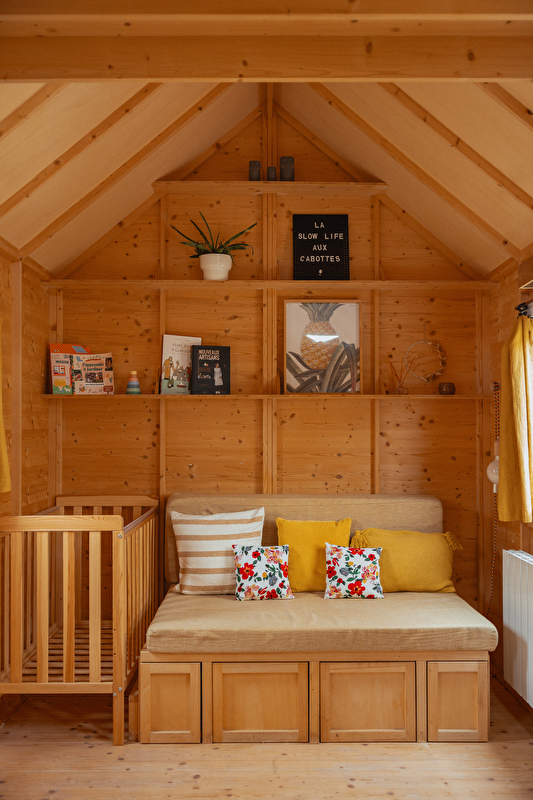 La Cabotte Jaune, c'est le repaire de la tribu avec sa terrasse au 1er étage accessible par la mezzanine et ses nombreuses surprises pour petits et grands (livres, vinyles, jeux...). Terrasse et bain nordique privatif.