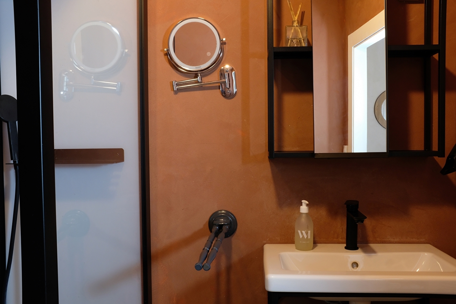• Salle de bain moderne avec douche, gel douche et shampoing WhatMatters fournis.