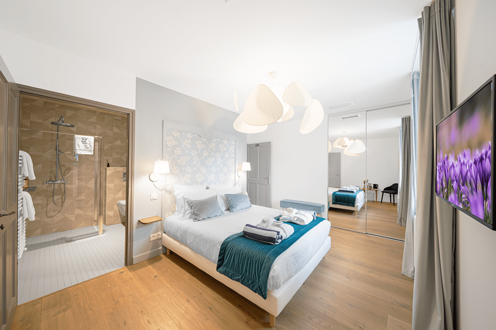 Cette suite de 60 m², située au 1er étage, offre de très beaux volumes avec une importante hauteur sous plafond. Avec sa baignoire au pied du lit, sa douche et son WC séparés, son salon avec un canapé convertible, cette suite parentale ou nuptiale ravira les amateurs de la Dolce Vita.