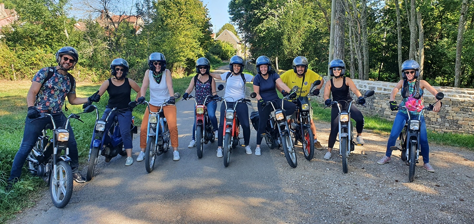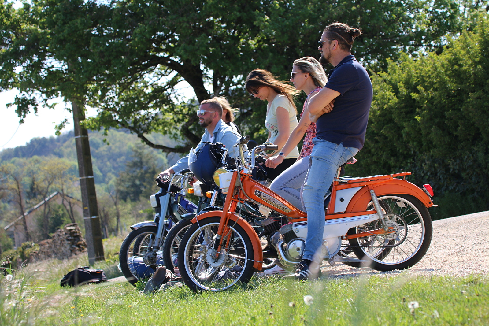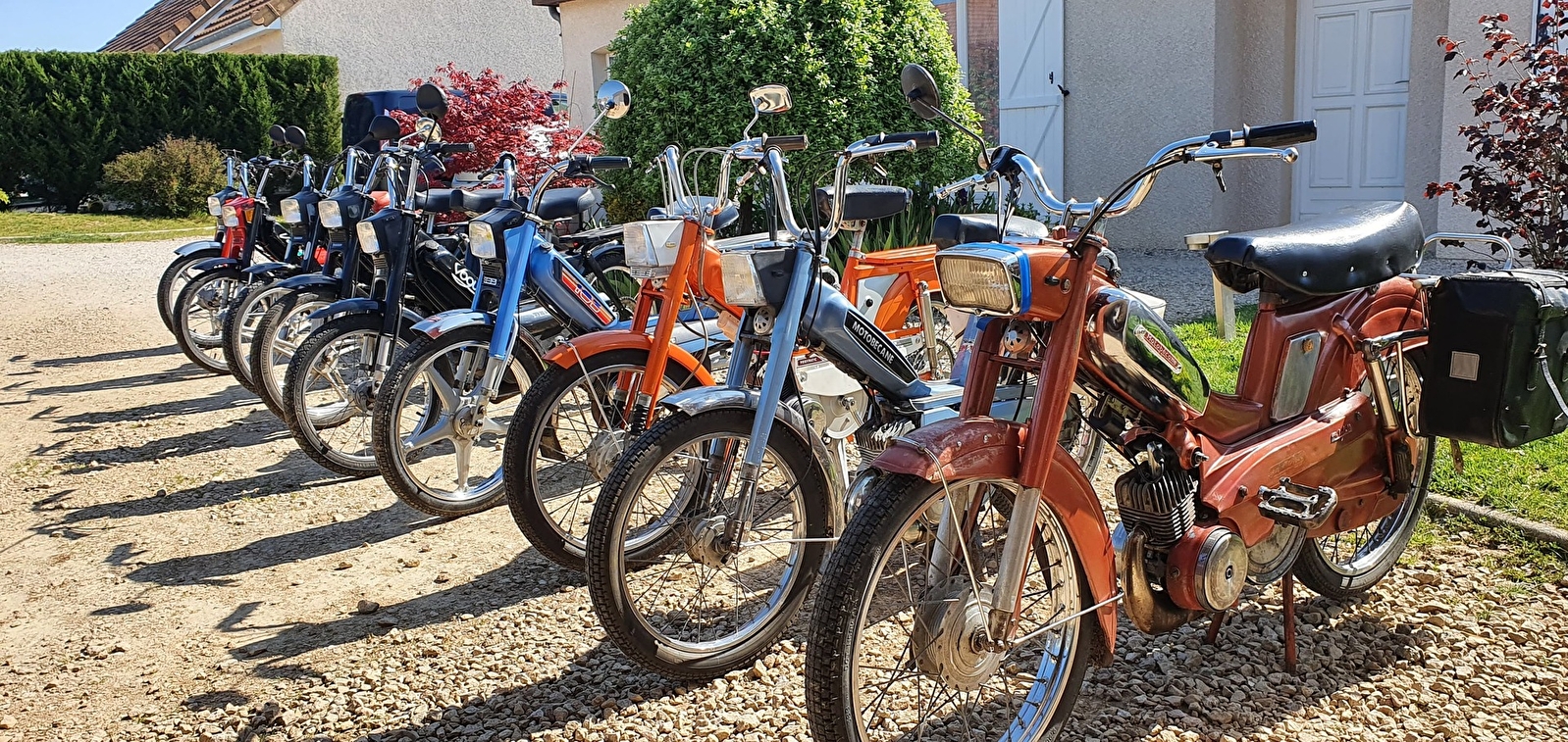 Accrochez votre casque, enfilez vos gants, 3 coups de pédale et…. Vous voilà parti à la vitesse folle de 45 km/h pour vivre une expérience unique et exclusive. Partez au guidon de nos mobylettes d’époques et visitez la côte chalonnaise, arpentez nos routes secondaires et profitez d’un moment convivial en famille ou entre amis !