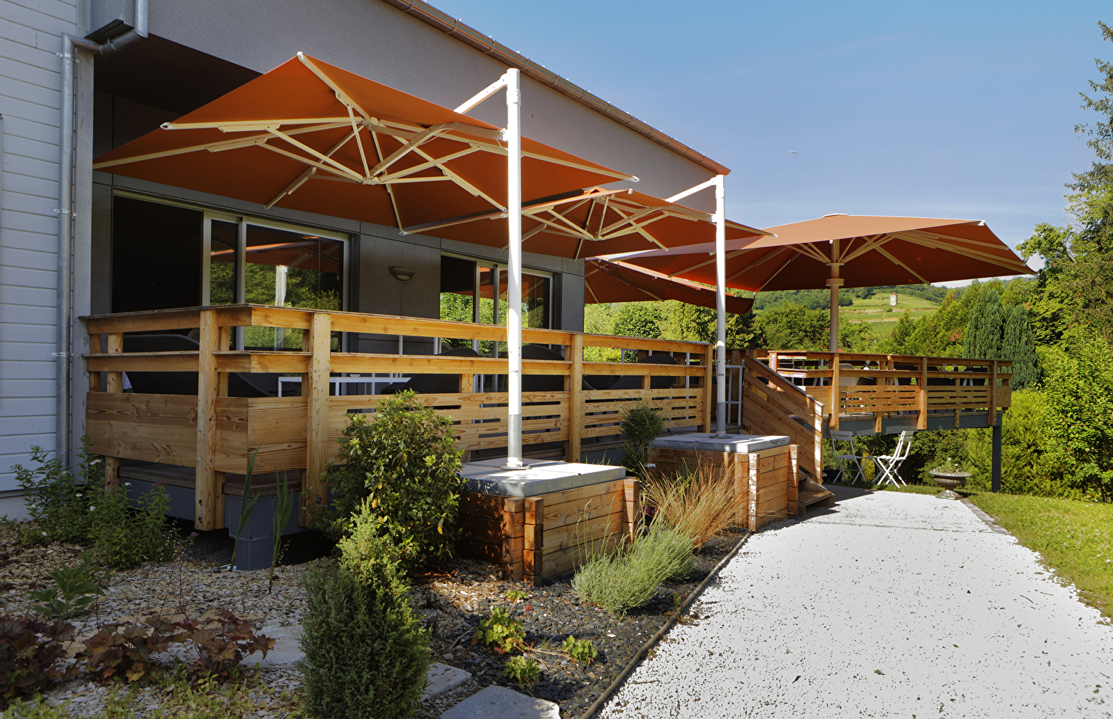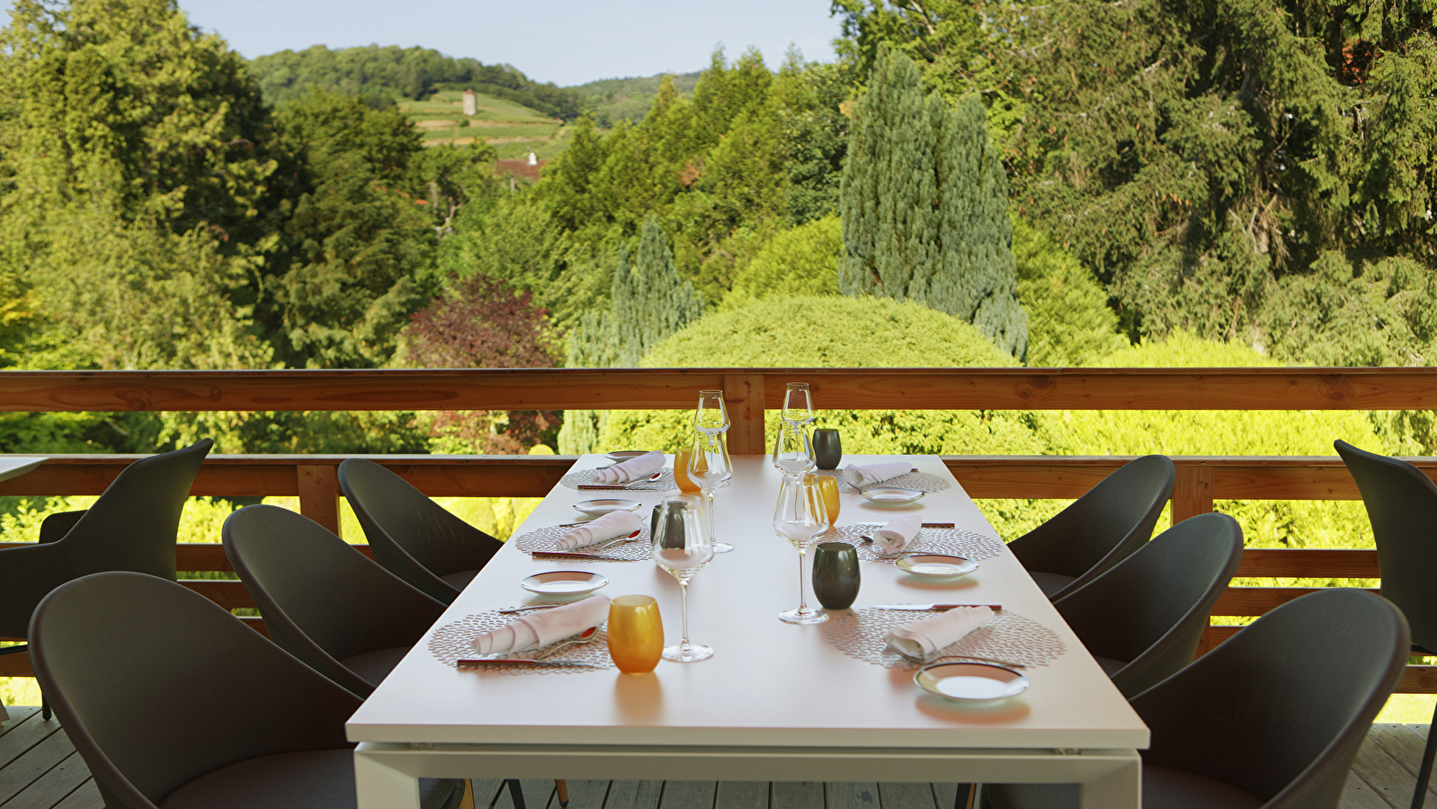 Durant l'été, une terrasse ombragée et surplombant le parc vous invite à prendre un déjeuner ou dîner dans un écrin de verdure. La réservation est conseillée.